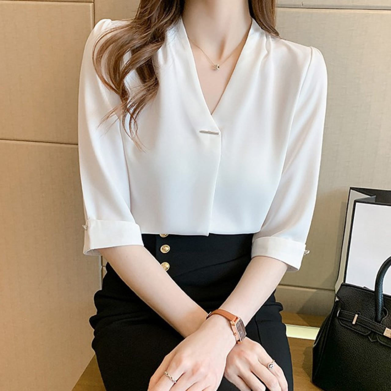 Three quarter sleeve elegant V neck chiffon blouse ( 2color )