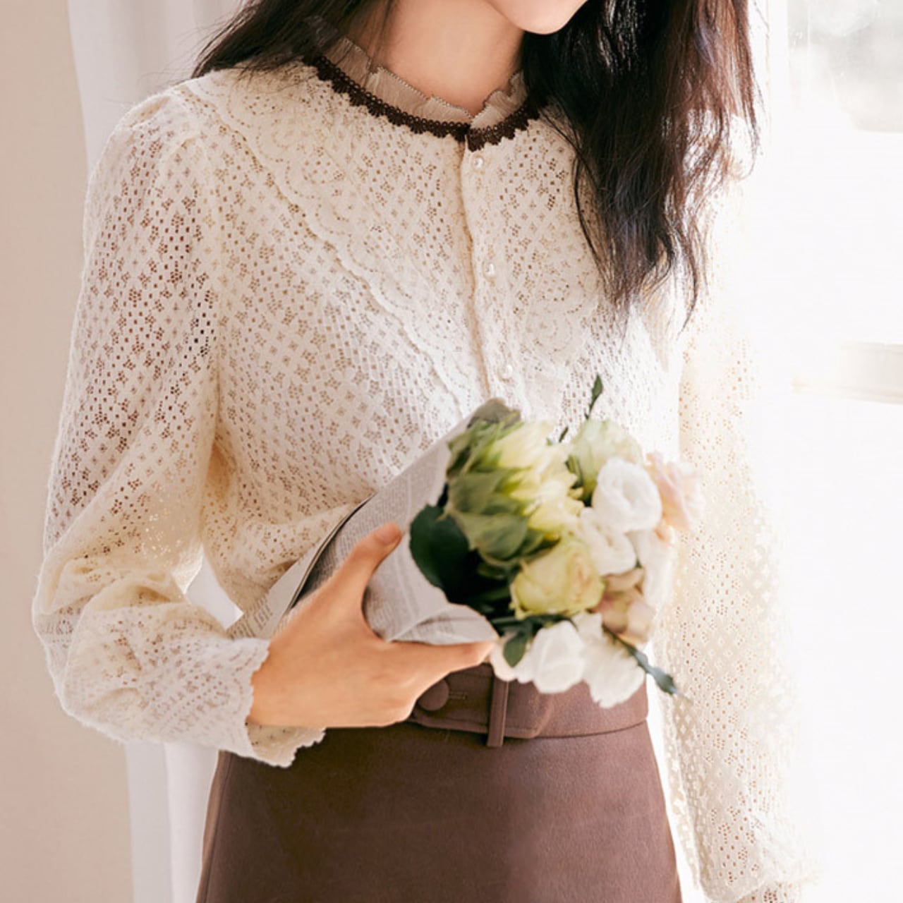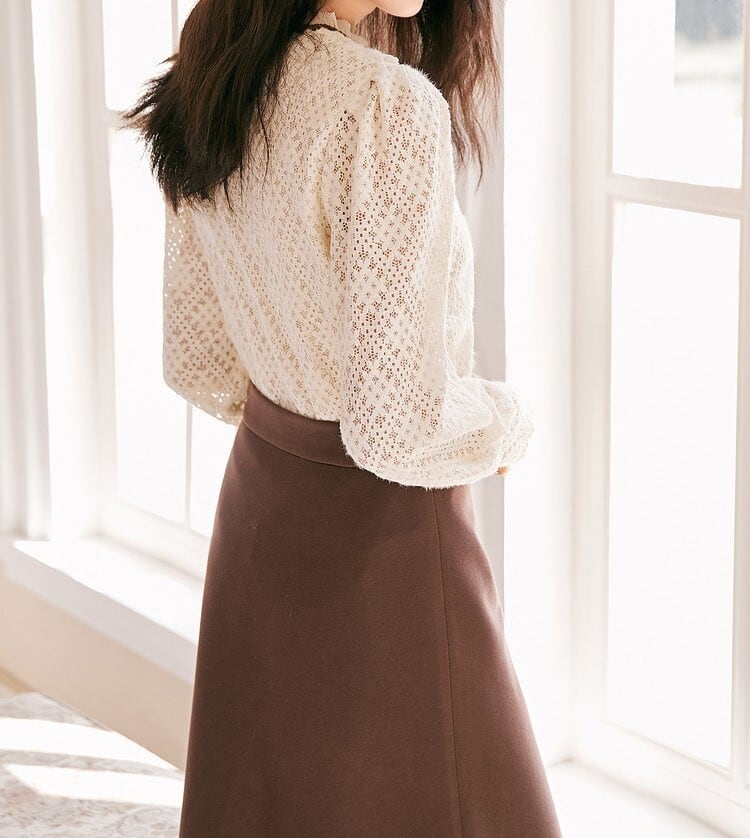着用するだけで上品で大人可愛い雰囲気が漂うスタンドネックエレガントレースブラウス。