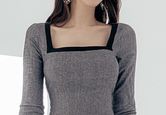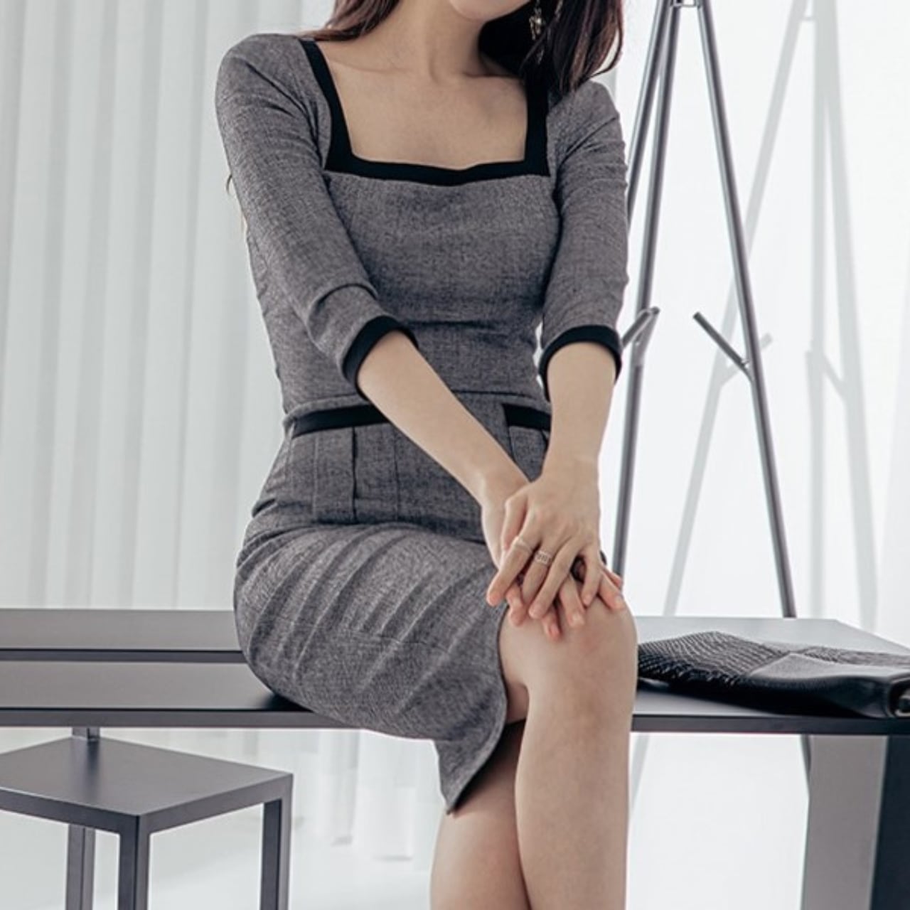 着用するだけでフェミニンな雰囲気が漂う七分袖エレガントスクエアネックミドルドレス。