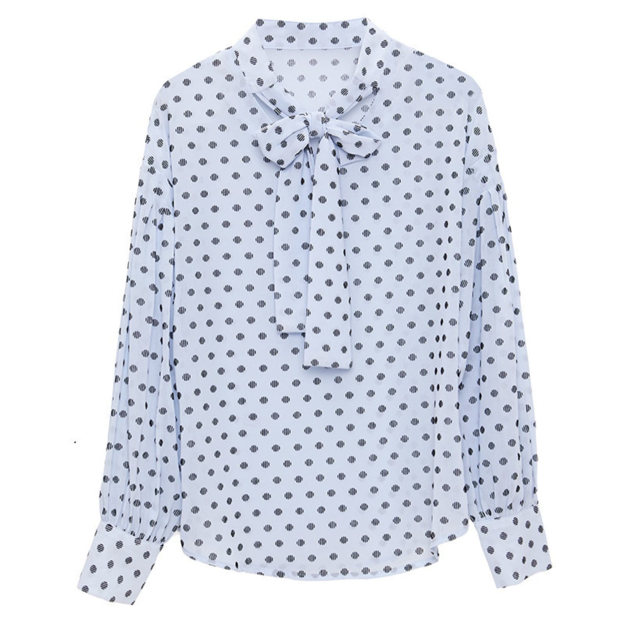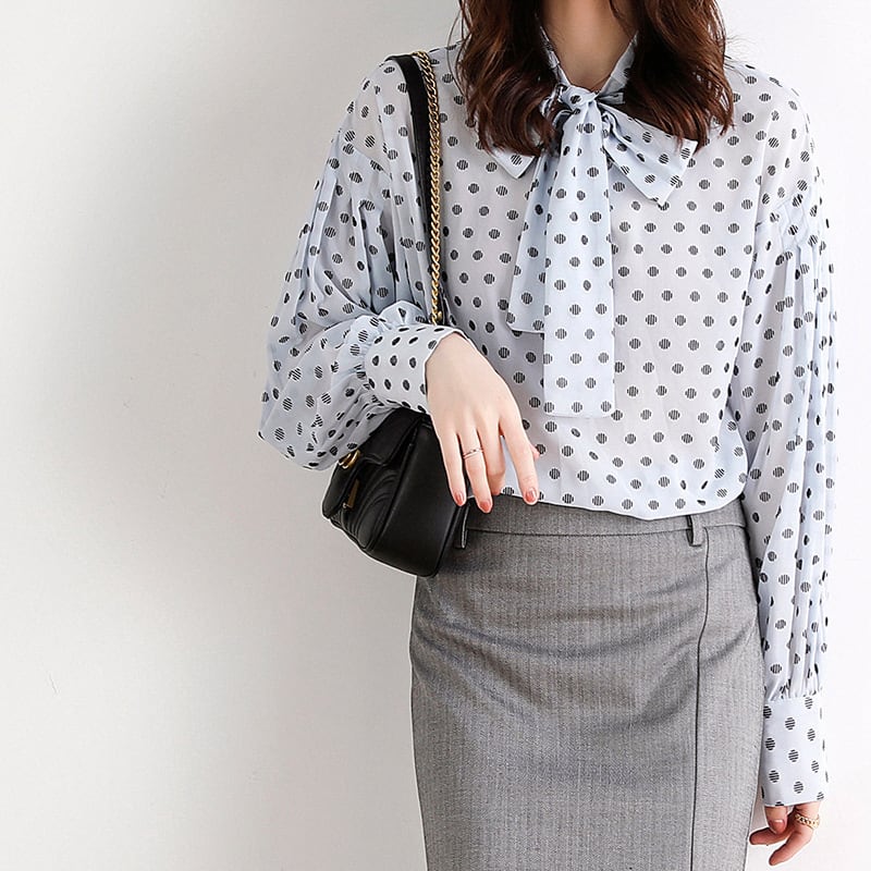 着用するだけで上品で大人可愛い雰囲気が漂うチェストリボンエレガントポルカドットシフォンブラウス 。