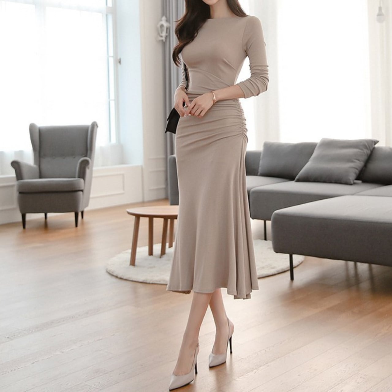 着用するだけで大人可愛い雰囲気が漂うエレガントスリムフィットニットドレス。
