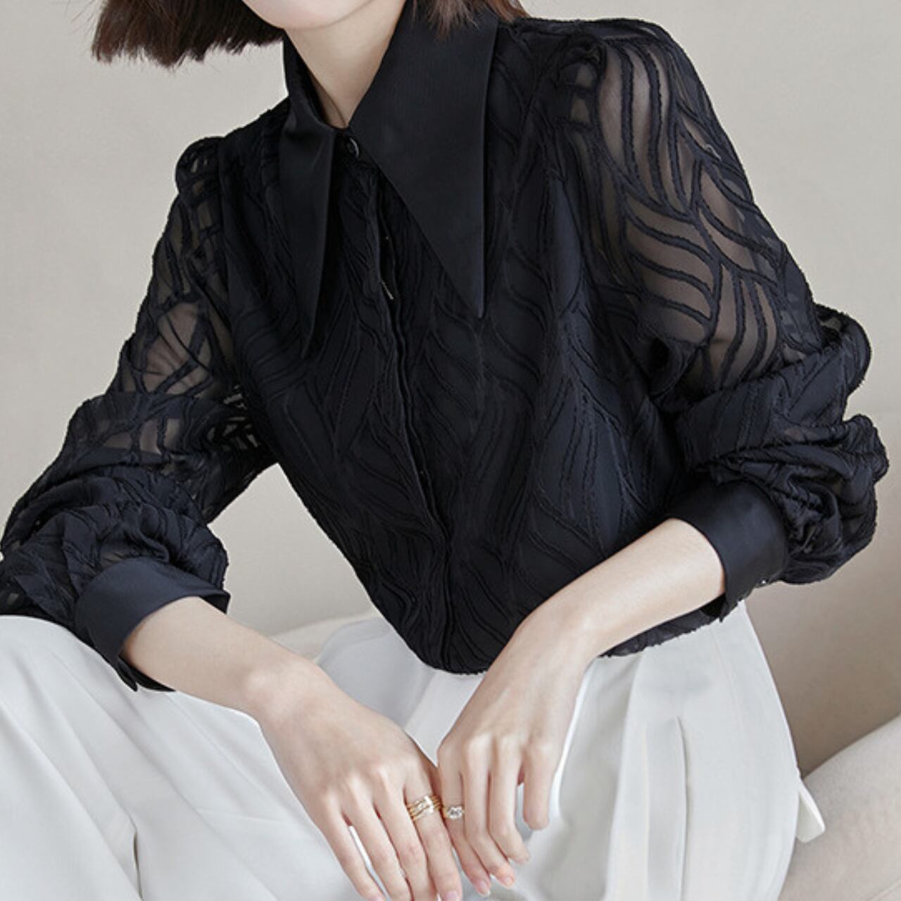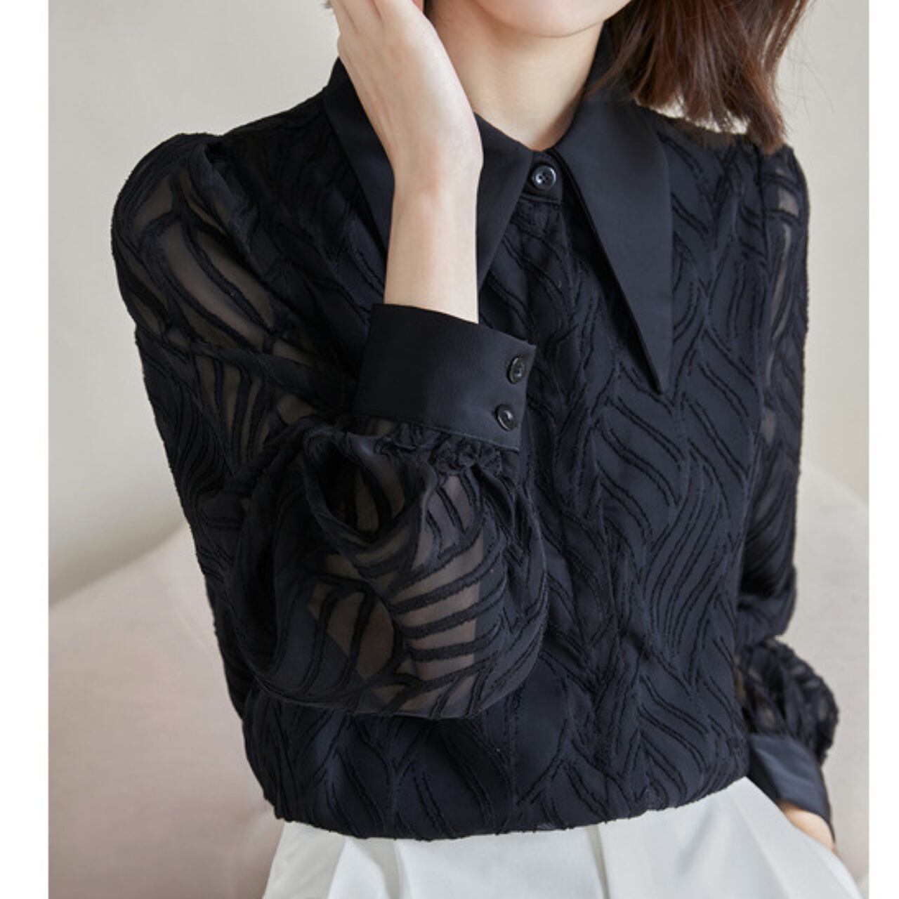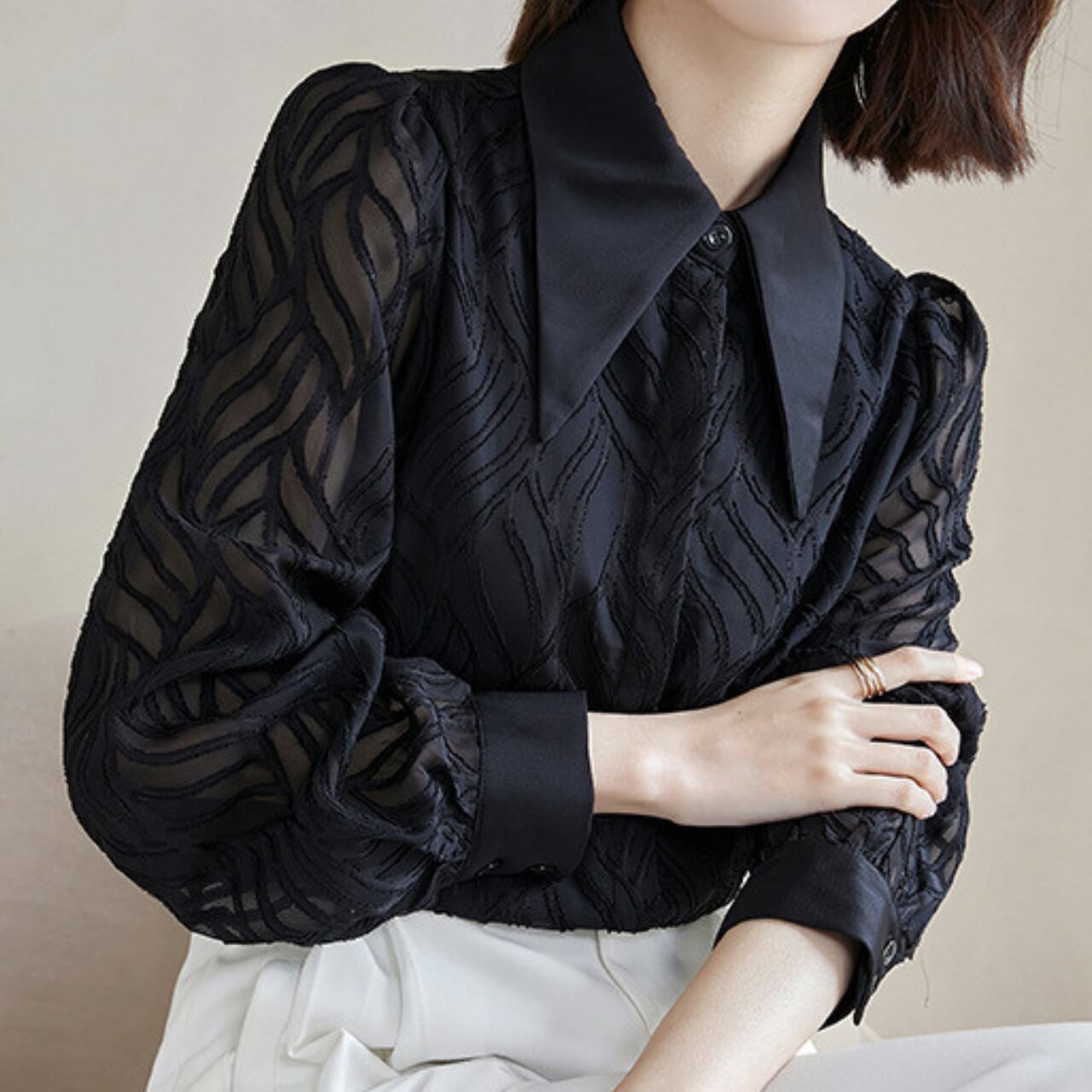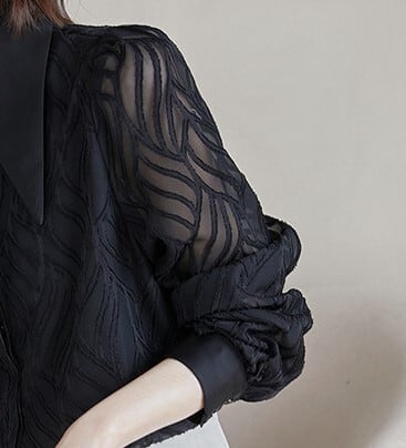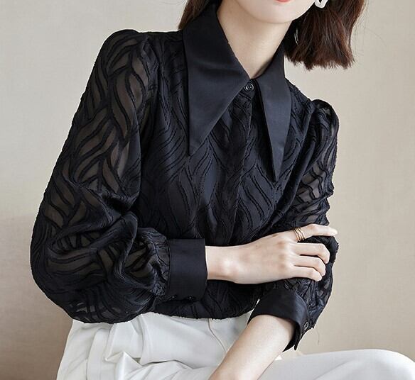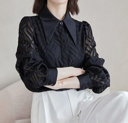 着用するだけで上品で大人可愛い雰囲気が漂うレーススリーブエレガントシフォンブラウス。
