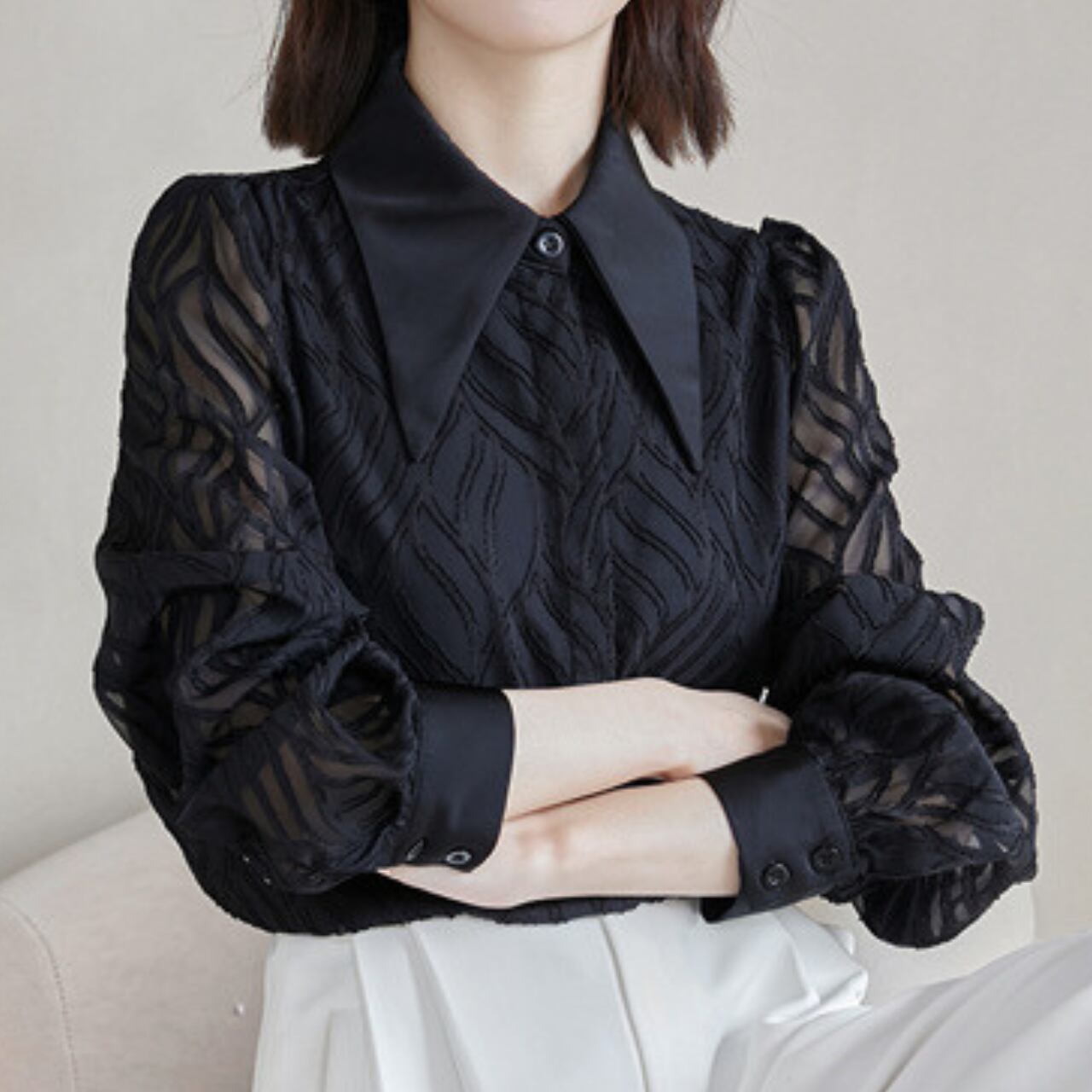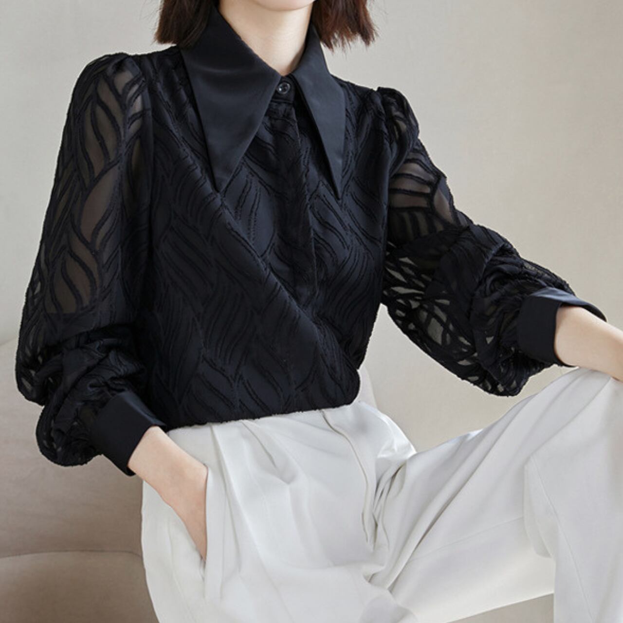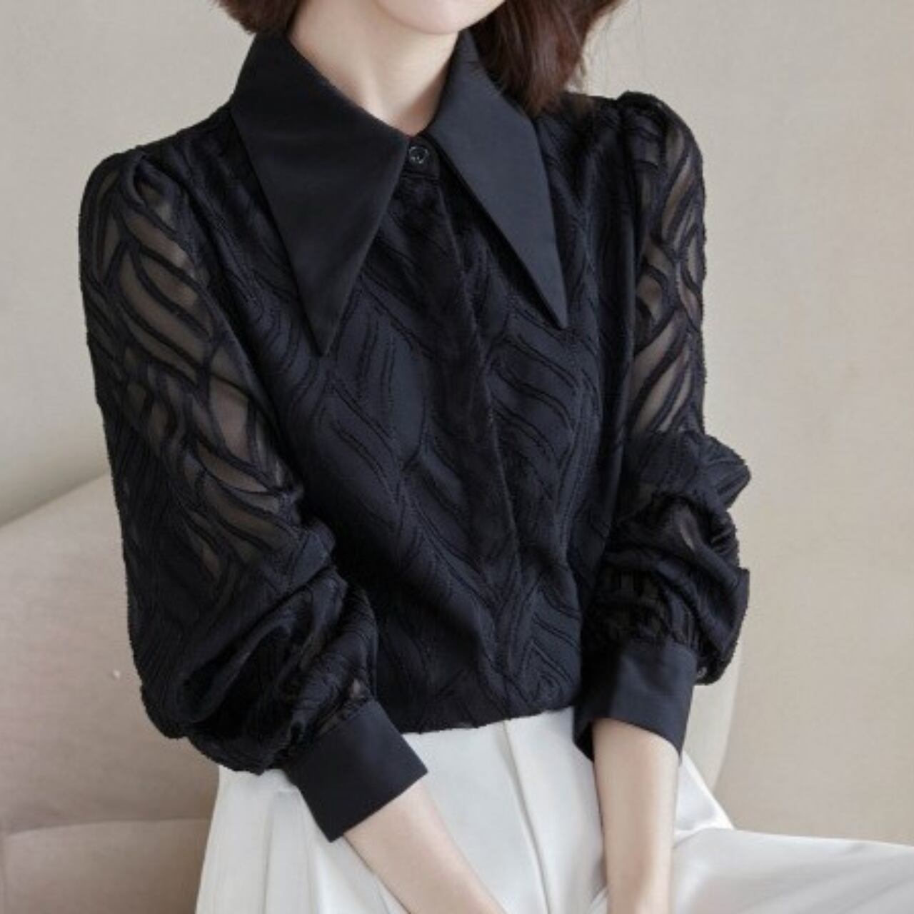 着用するだけで上品で大人可愛い雰囲気が漂うレーススリーブエレガントシフォンブラウス。