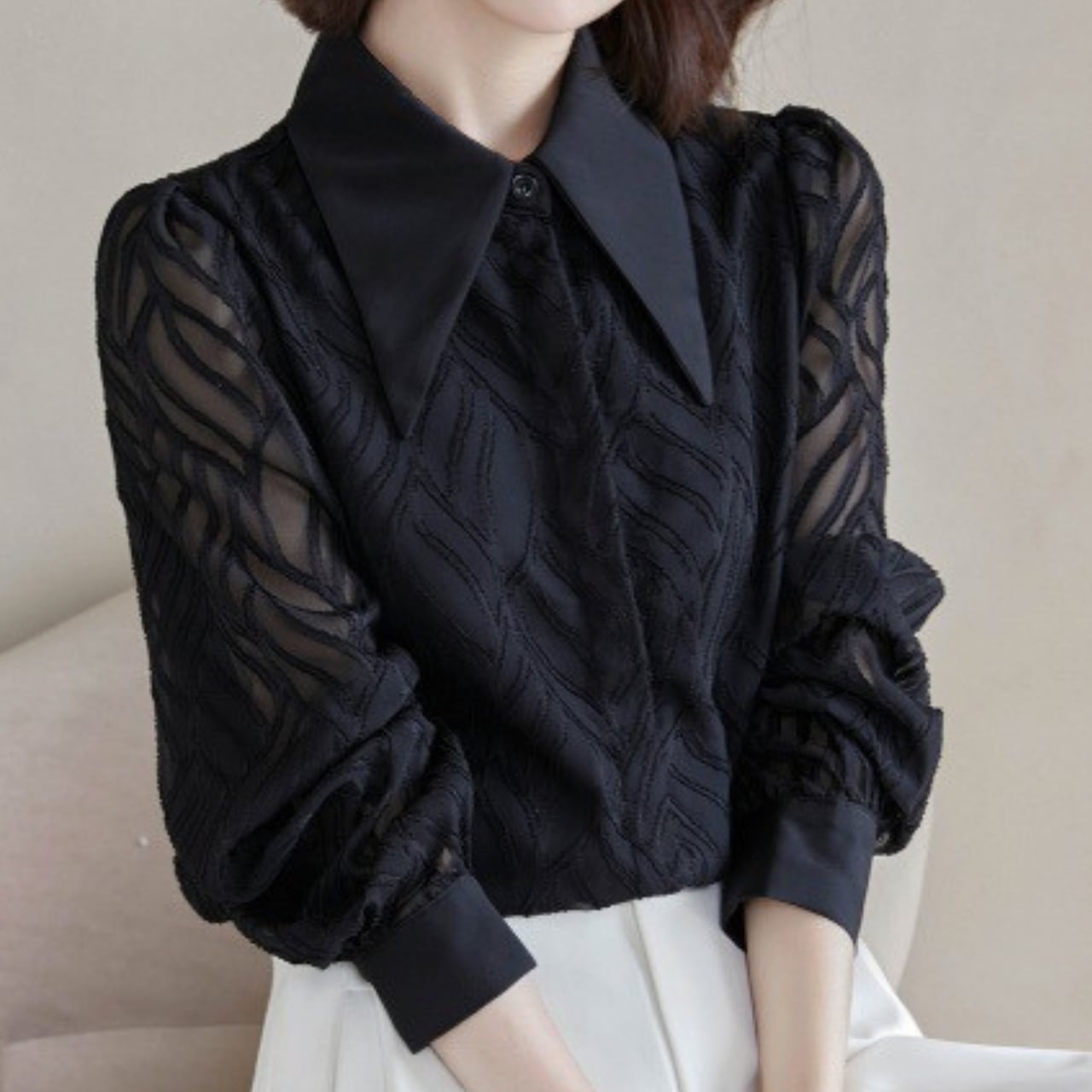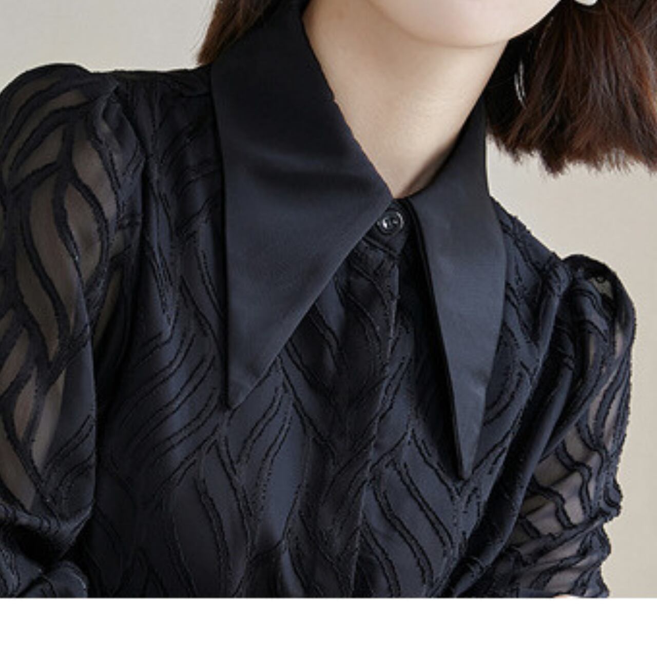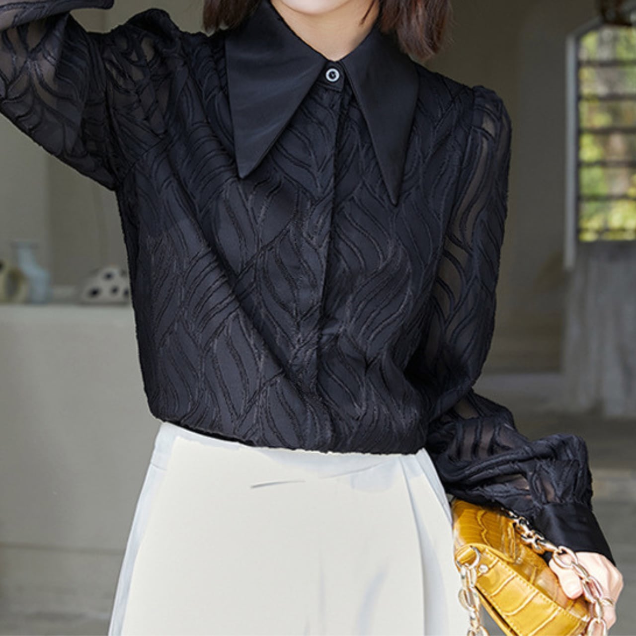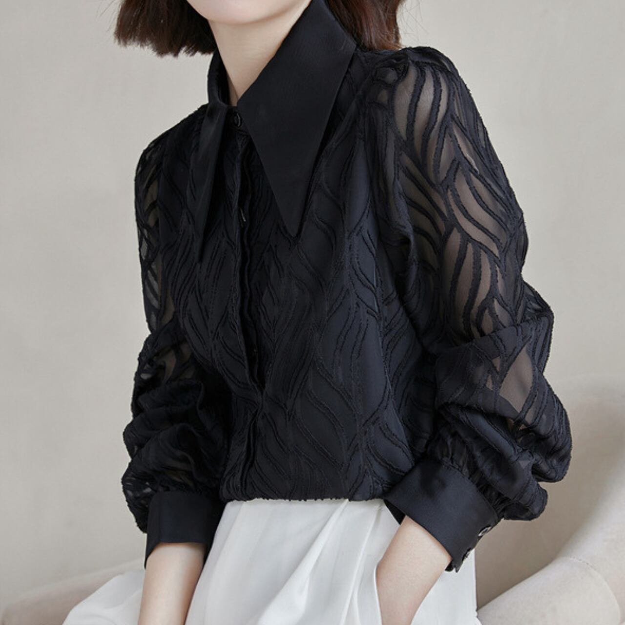 着用するだけで上品で大人可愛い雰囲気が漂うレーススリーブエレガントシフォンブラウス。