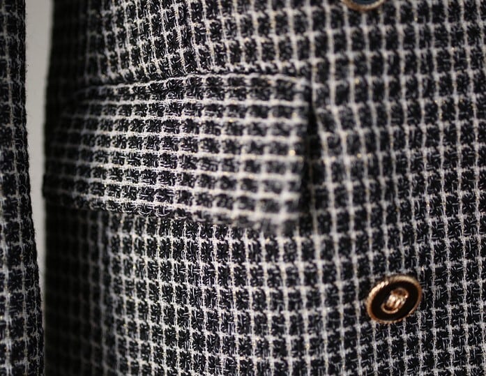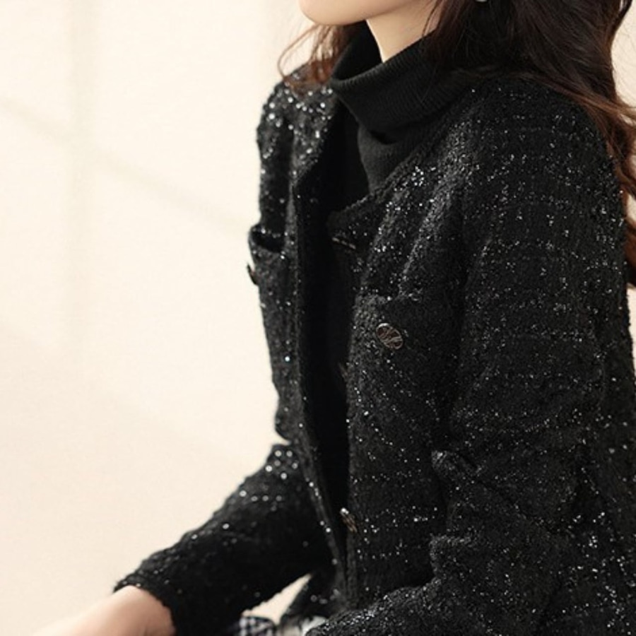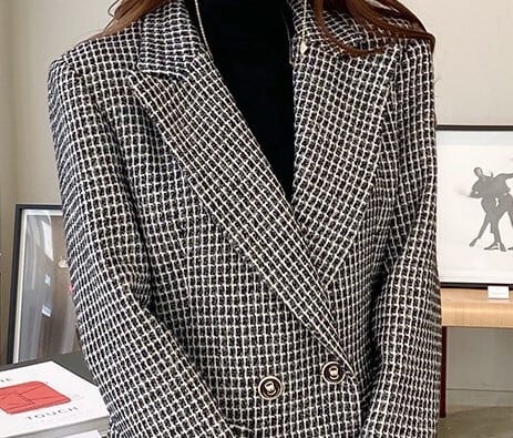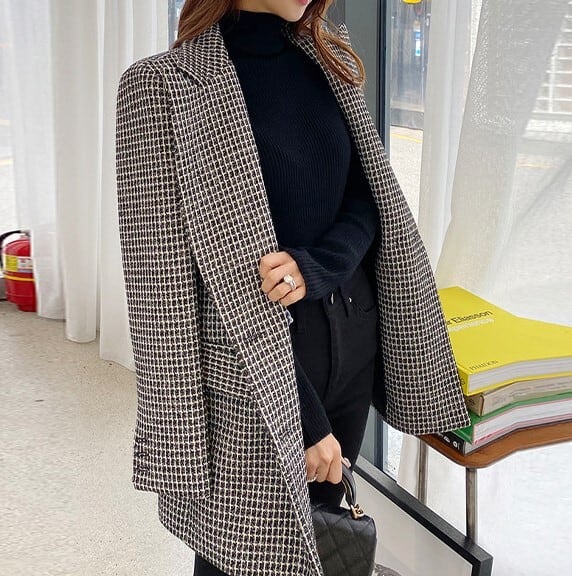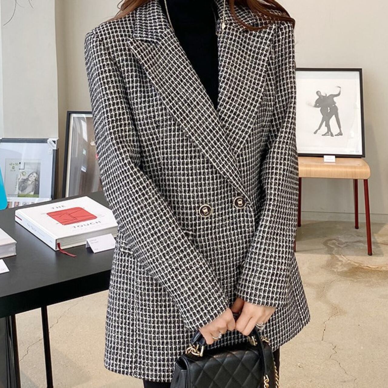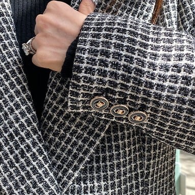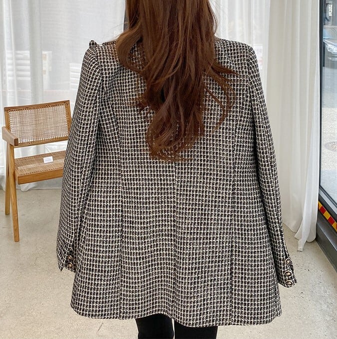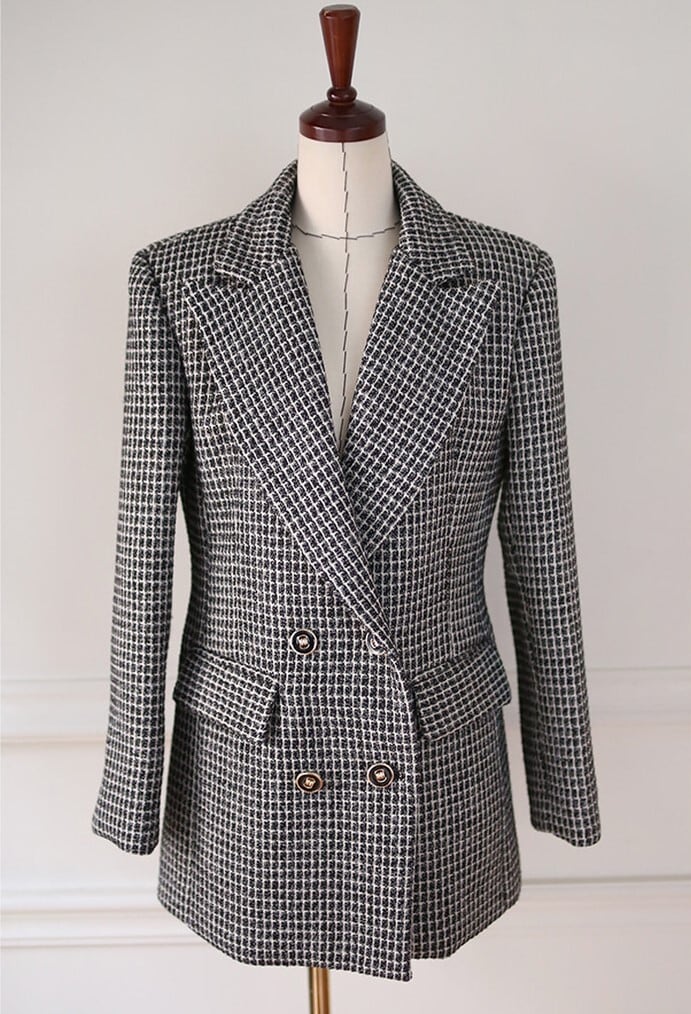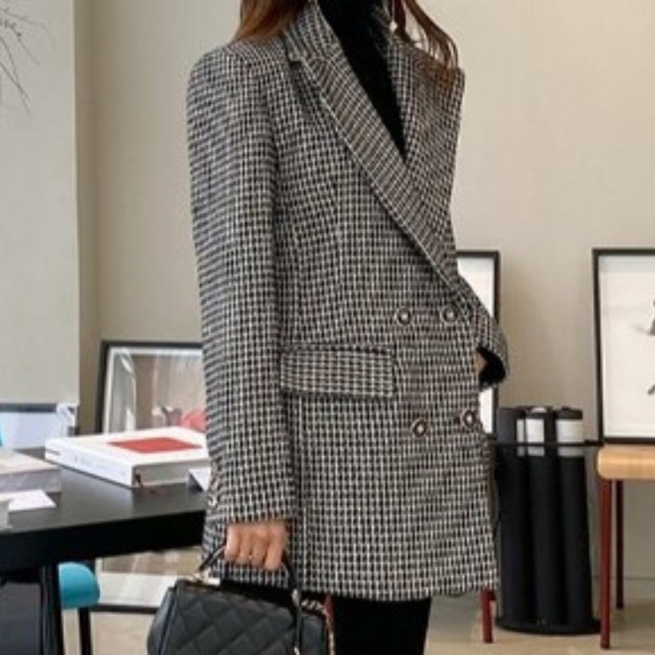 着用するだけで上品でフェミニンな雰囲気が漂う千鳥格子エレガントダブルジャケット。