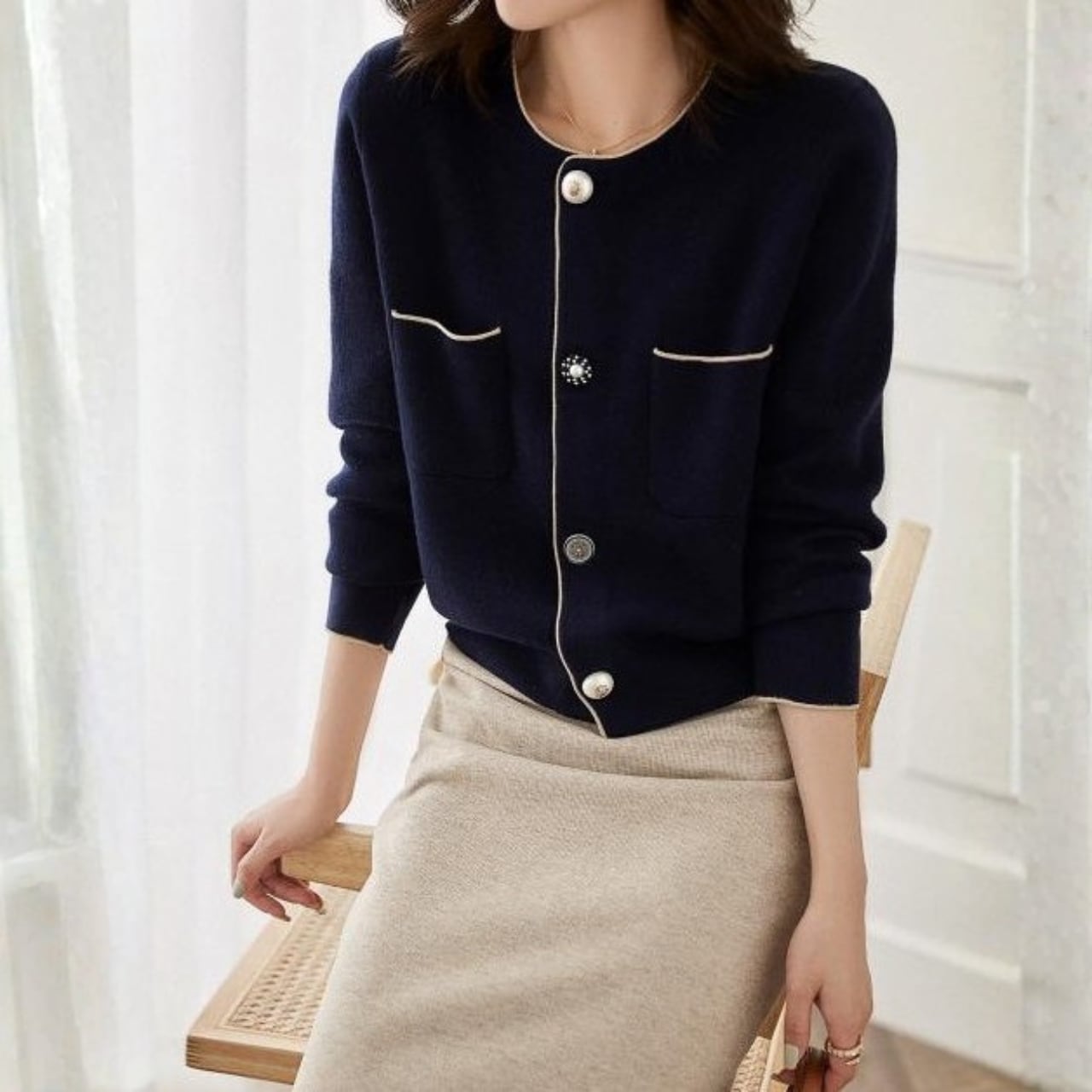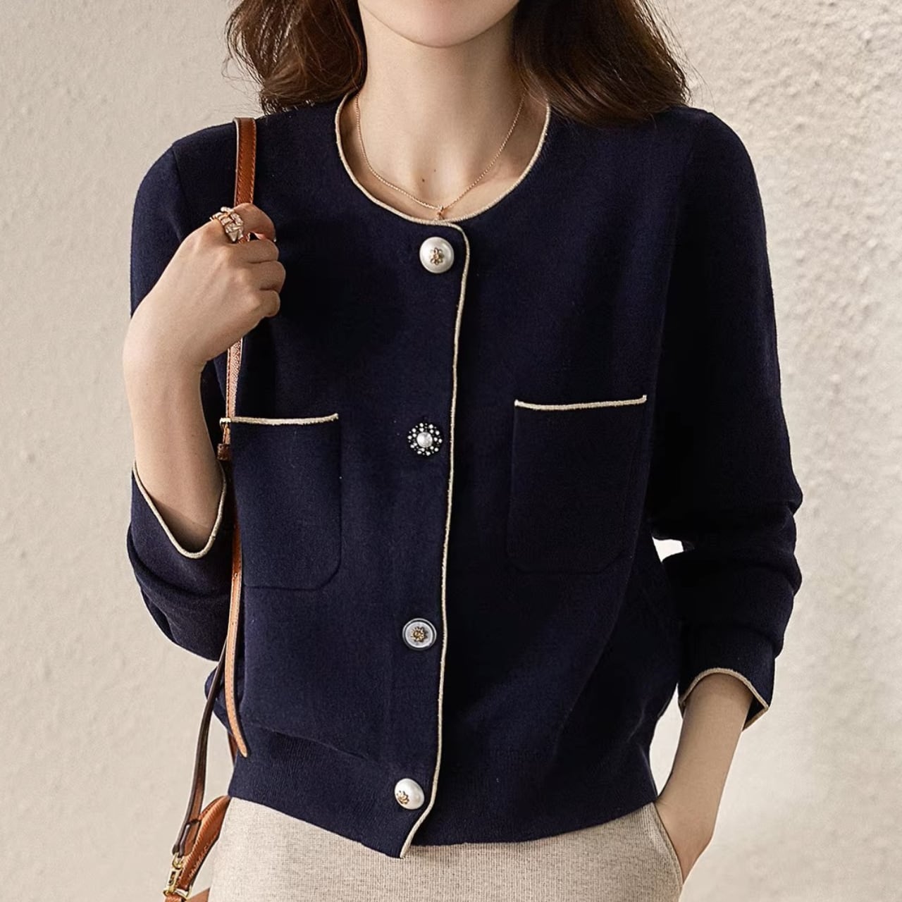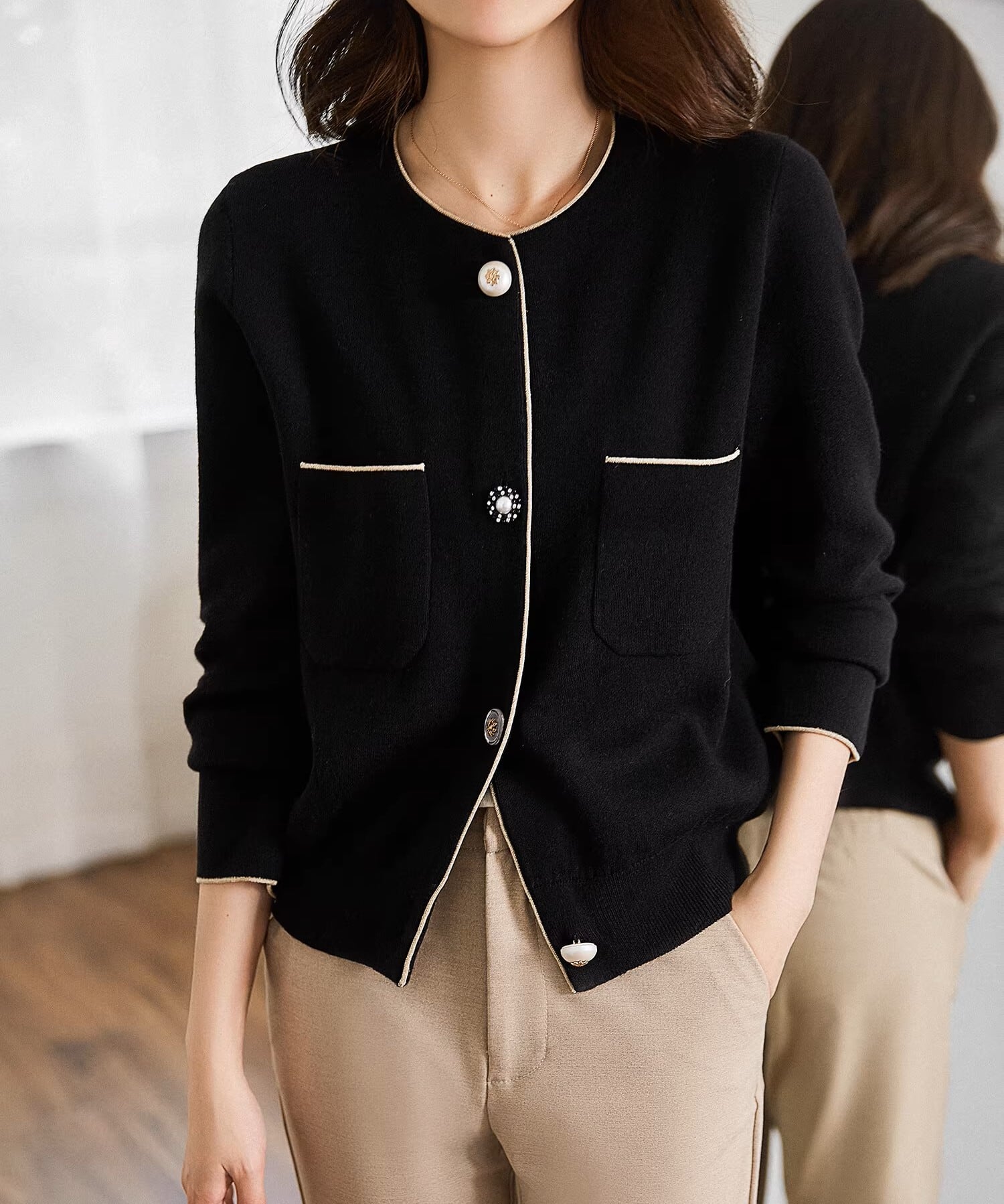 着用するだけでエレガントな雰囲気が漂うカラーレスエレガントパールステッチスリムニットジャケット。