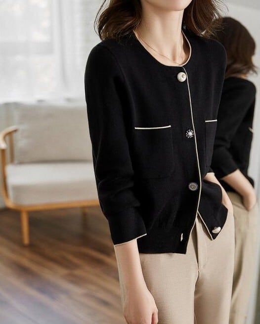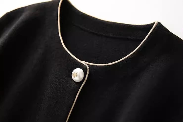 Collarless elegant pearl stitch slim knit jacket