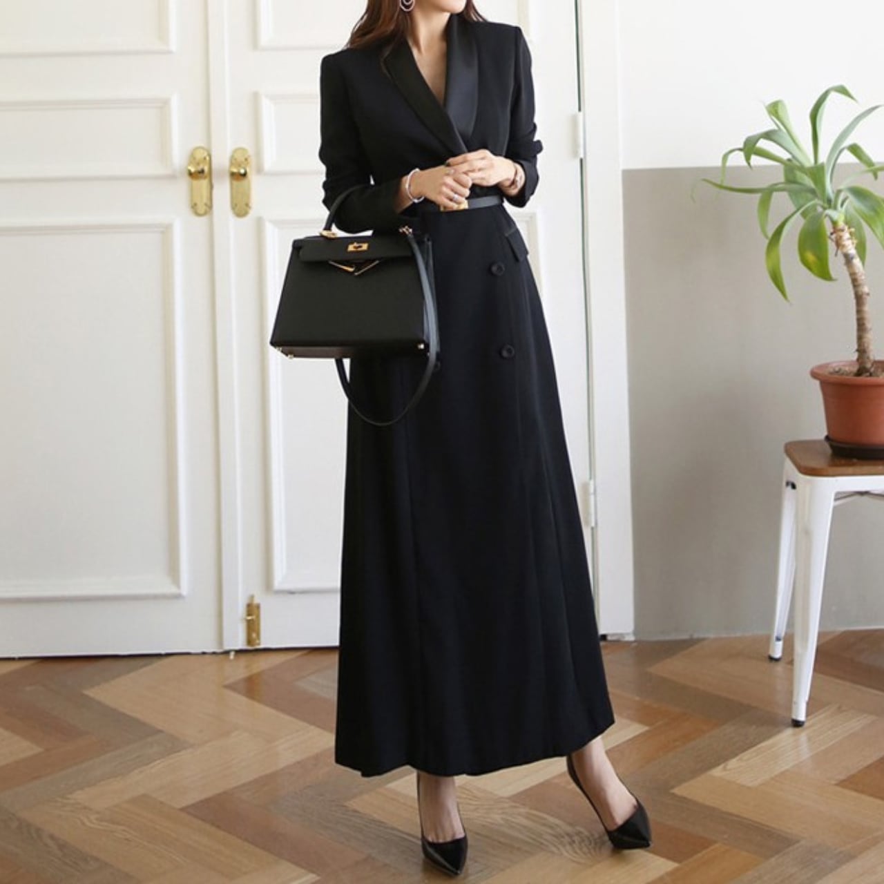 着用するだけで上品でフェミニンな雰囲気が漂うダブルブレストエレガントスリムトレンチロングドレス 。
