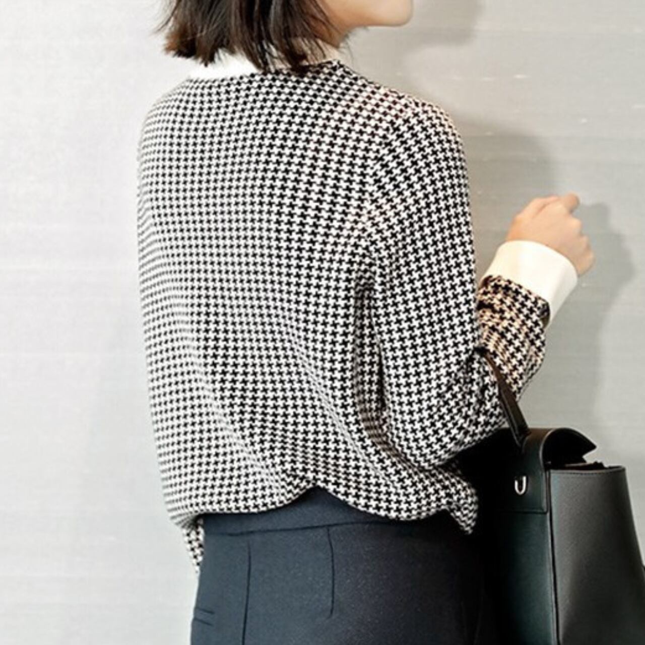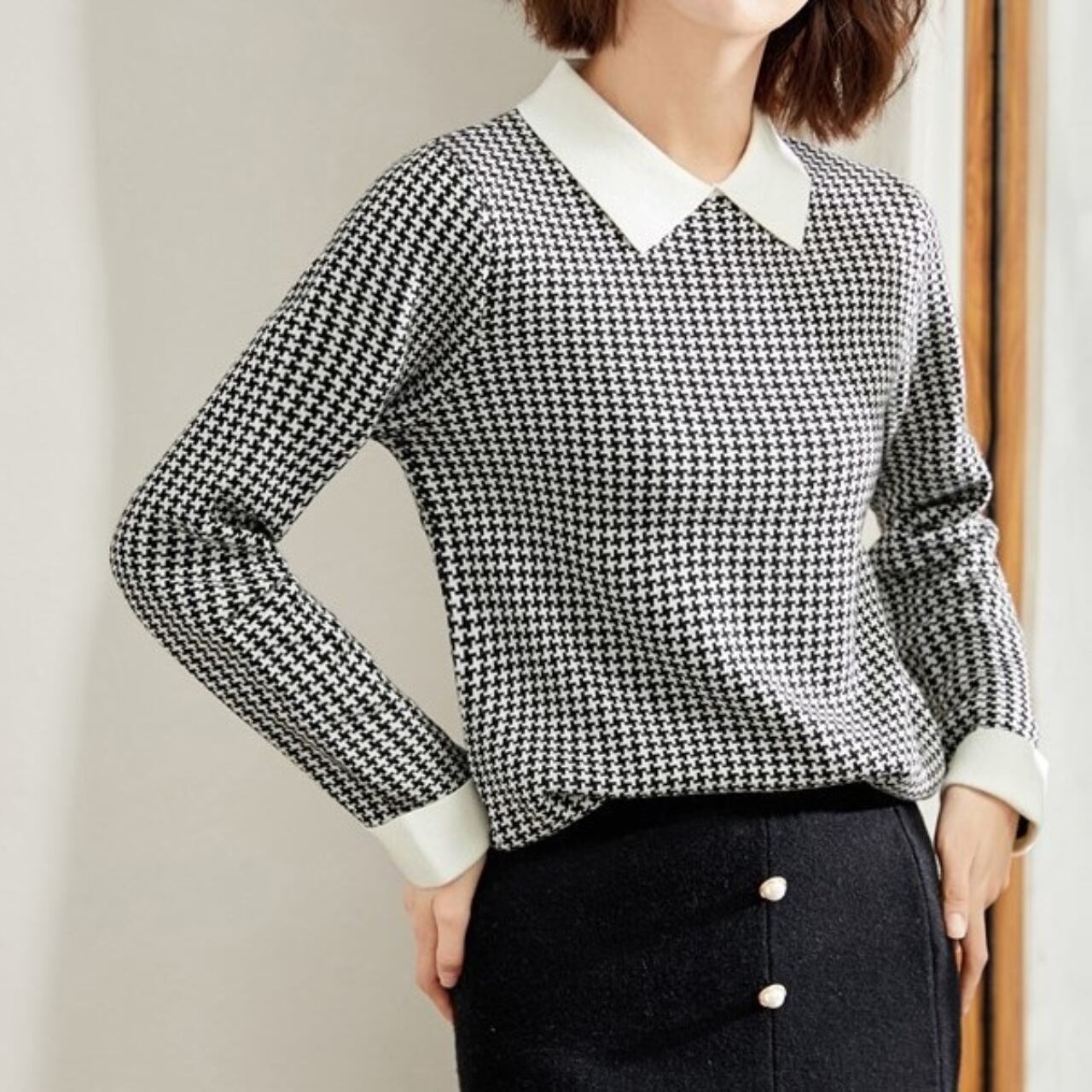 着用するだけで大人可愛い雰囲気が漂うポロカラーエレガント千鳥格子ニット。