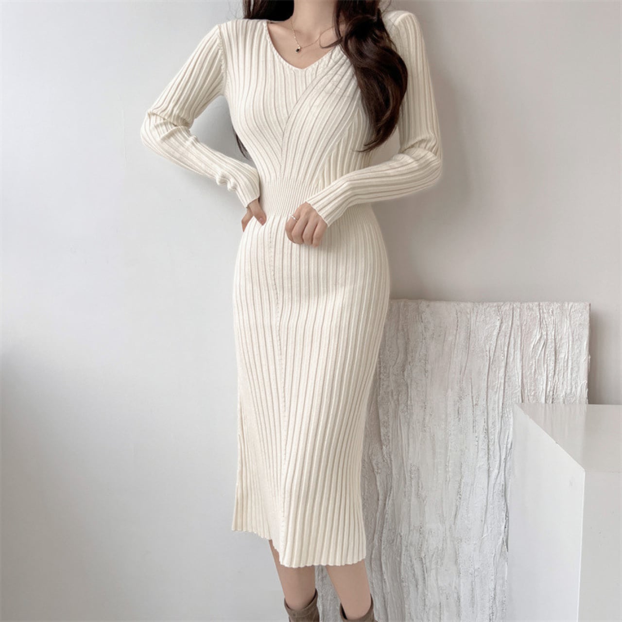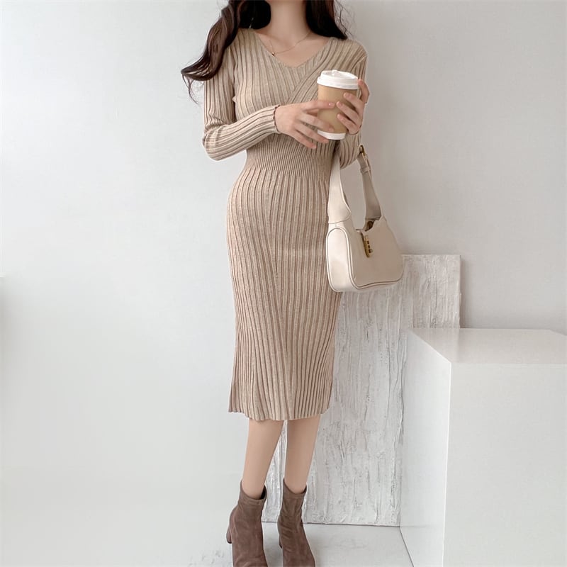 Waist slim elegant light rib knit dress
