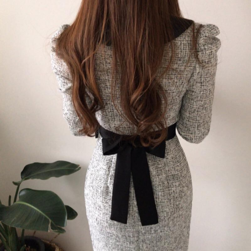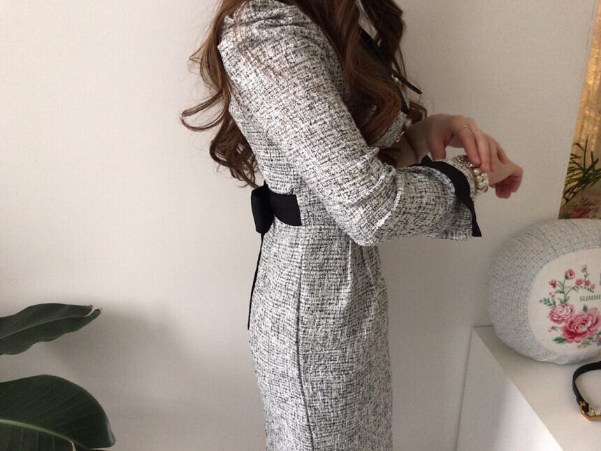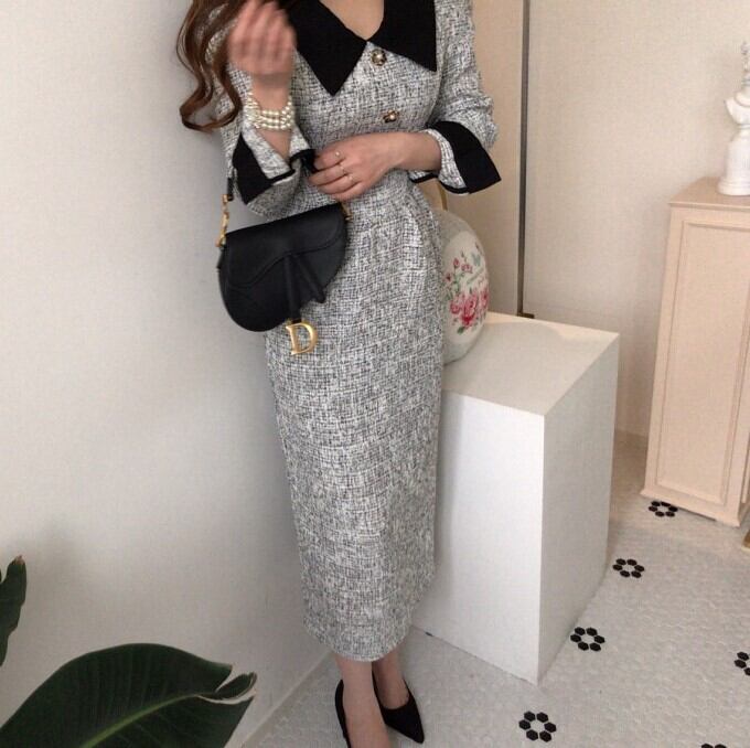 Collar stitch elegant long tweed dress