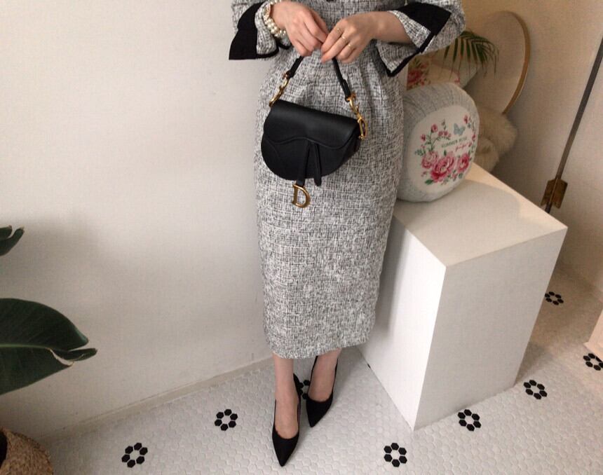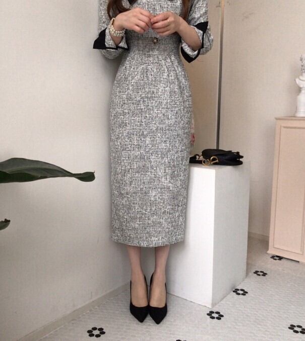 着用するだけでフェミニンな雰囲気が漂うカラーステッチエレガントロングツイードドレス 。