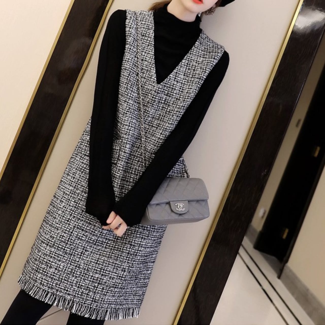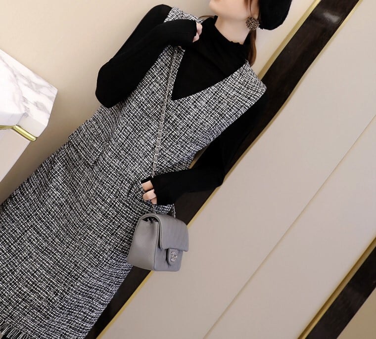 着用するだけでフェミニンな雰囲気が漂うVネックエレガントツイードミドルドレス 。