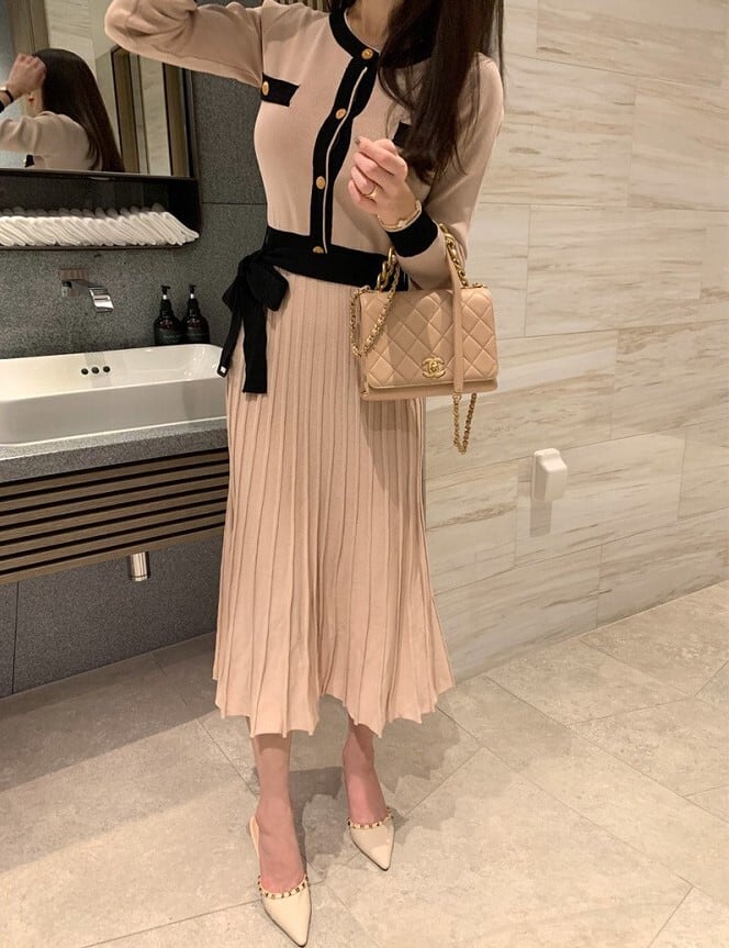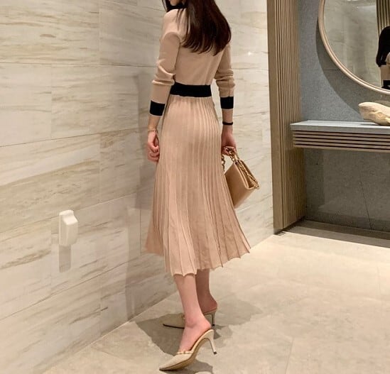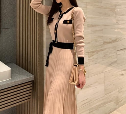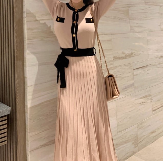 着用するだけでフェミニンな雰囲気が漂うシングルブレストエレガントプリーツニットドレス。