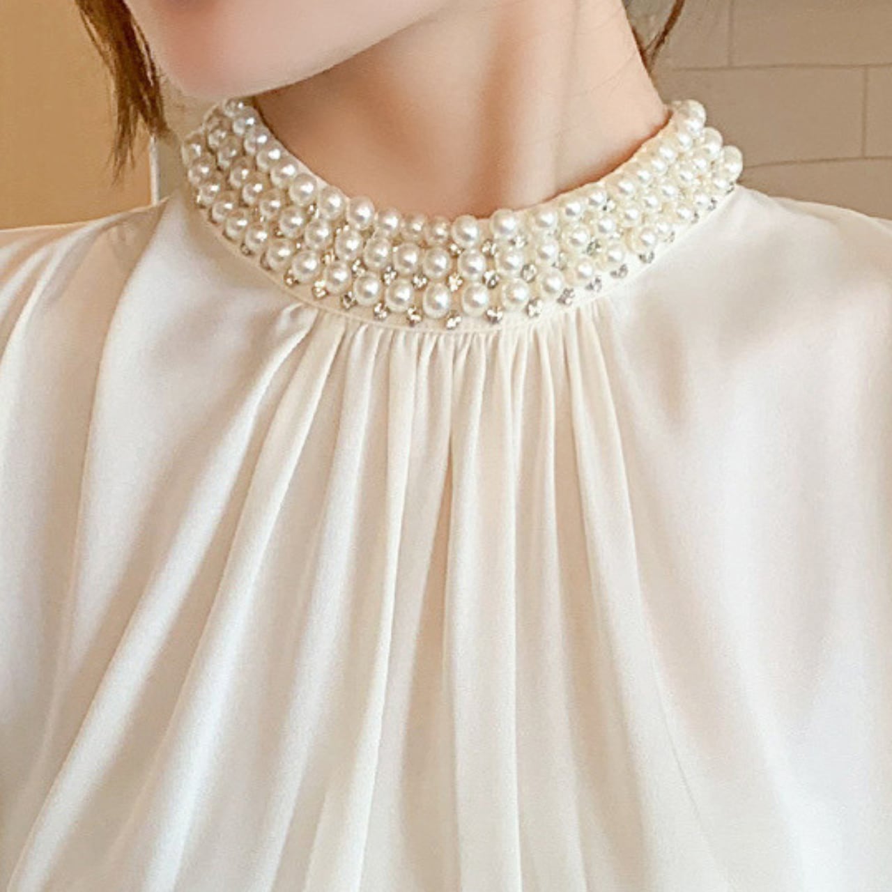 着用するだけで大人可愛さが漂うチェストパールエレガントシフォンシャツ。