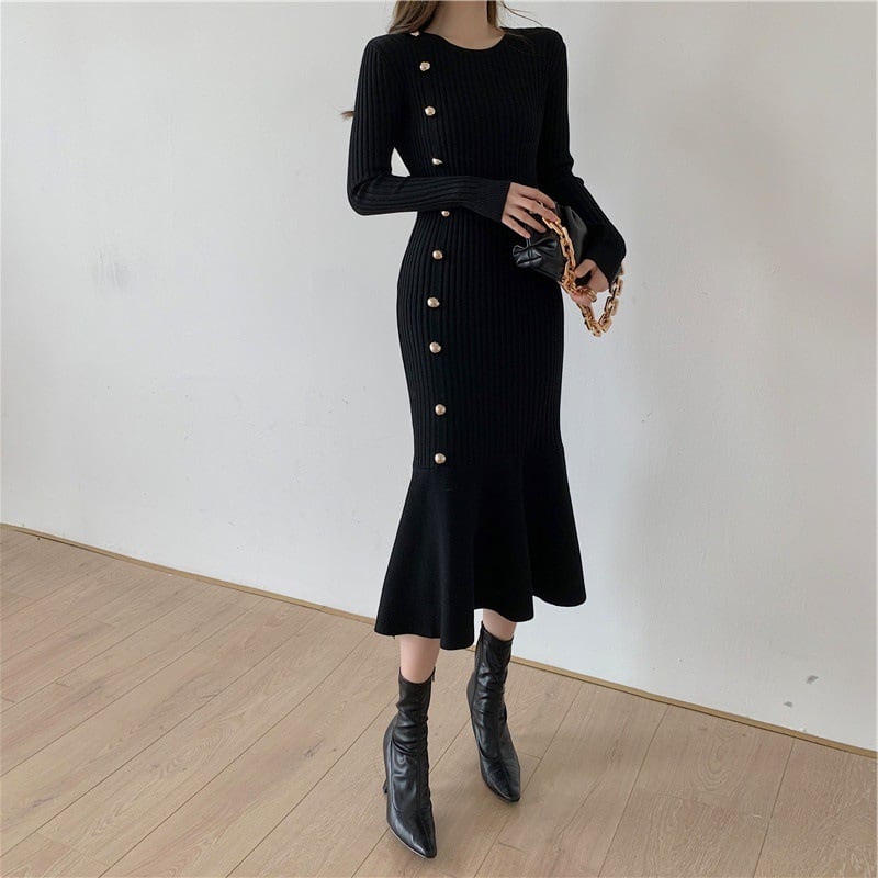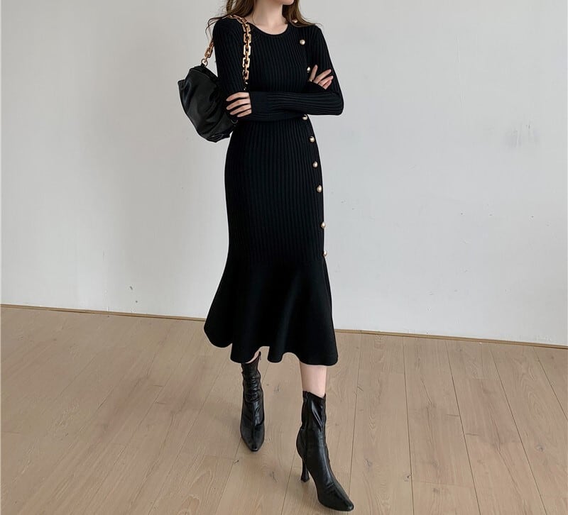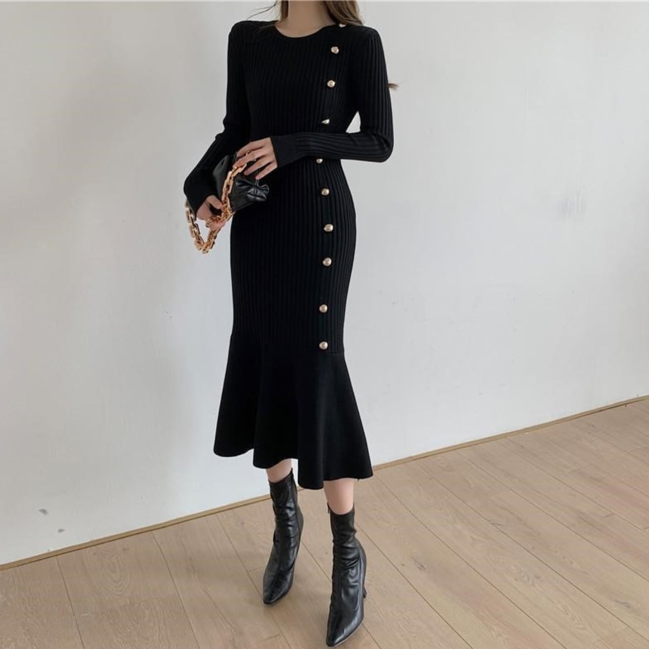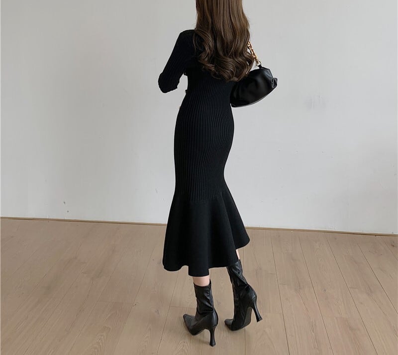 着用するだけで大人可愛い雰囲気が漂うスリムフィットエレガントニットマーメイドドレス。