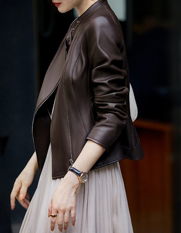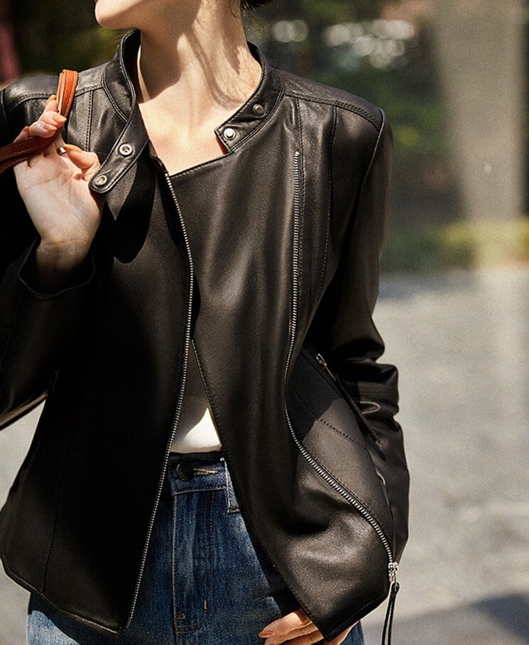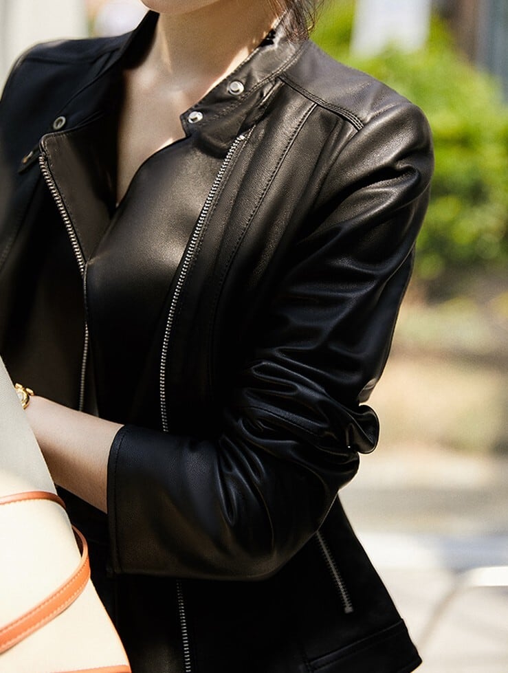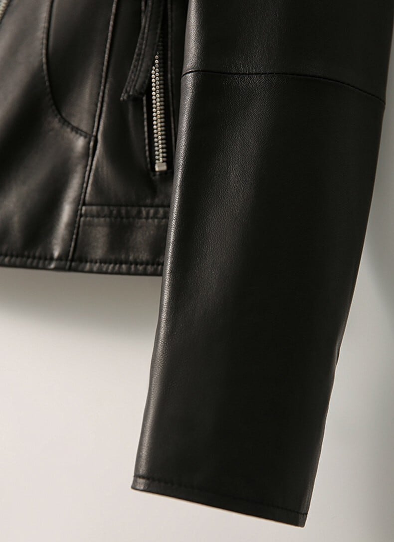 羽織るだけで大人可愛い雰囲気が漂うカラーレスエレガントフェイクレザーショートジャケット。
