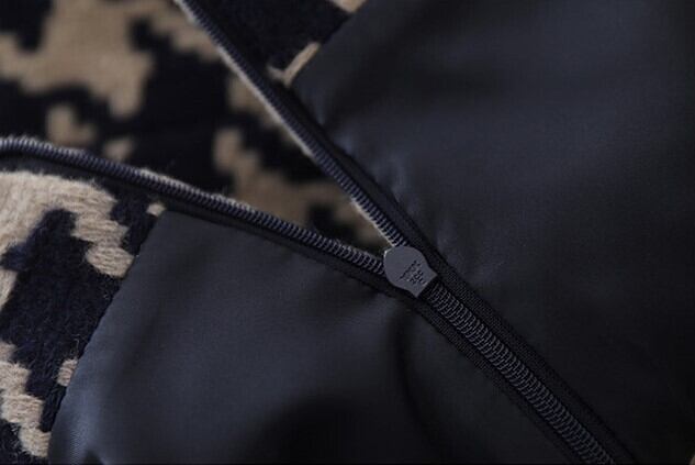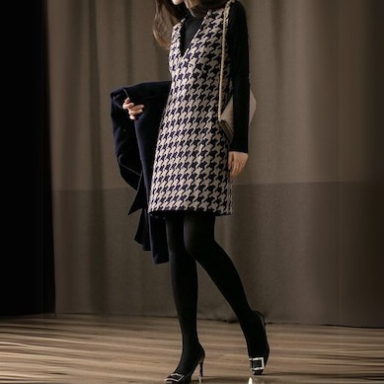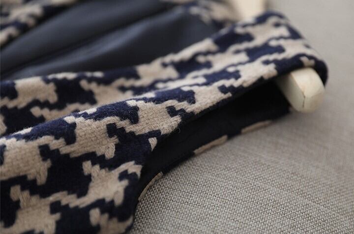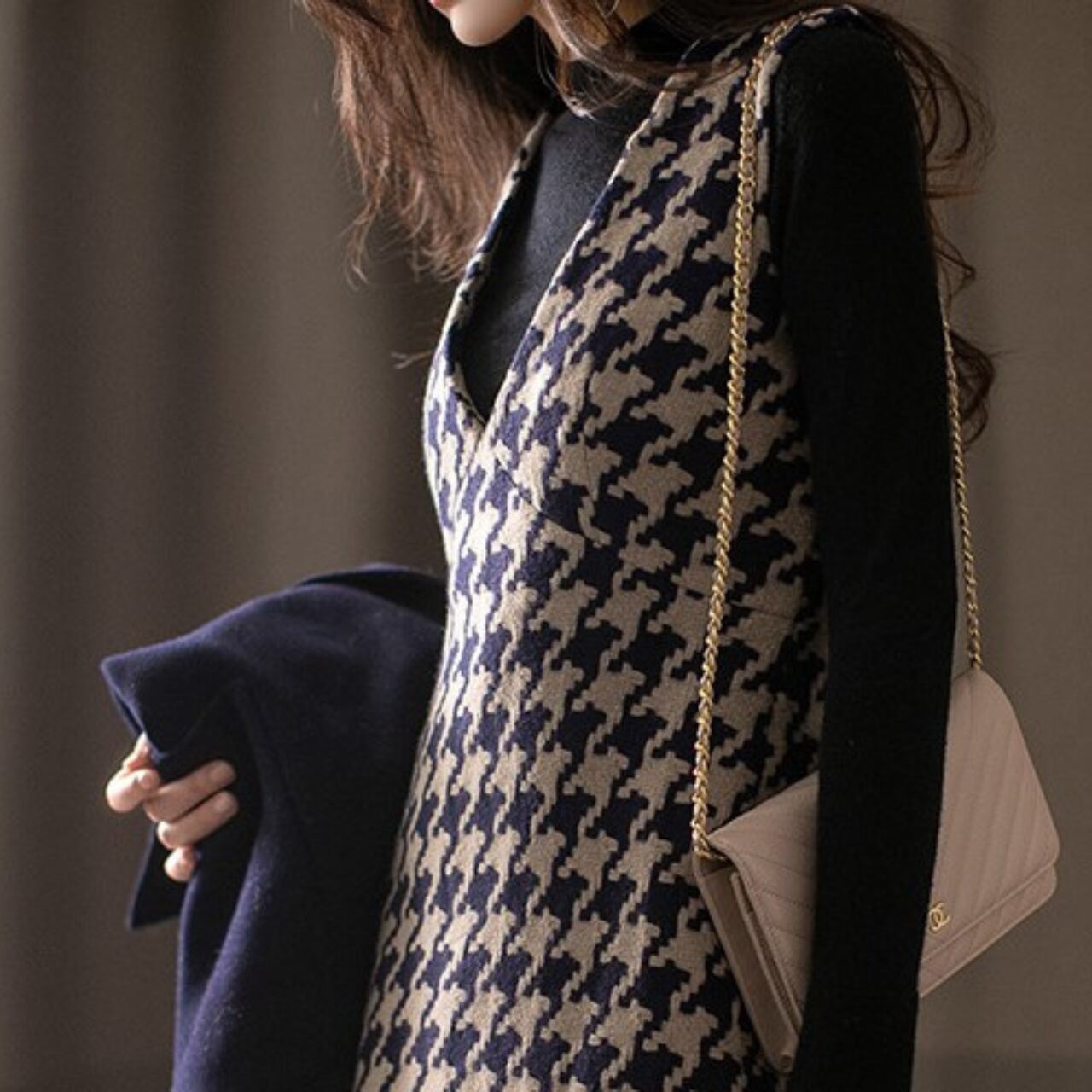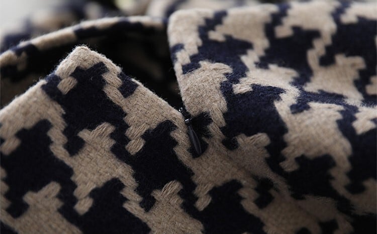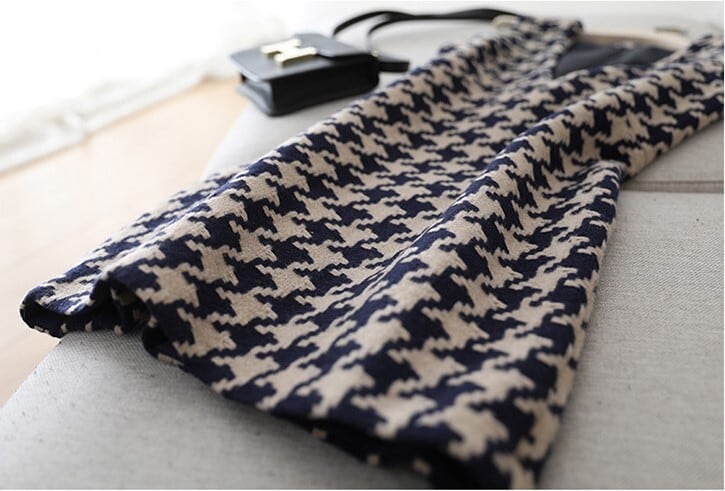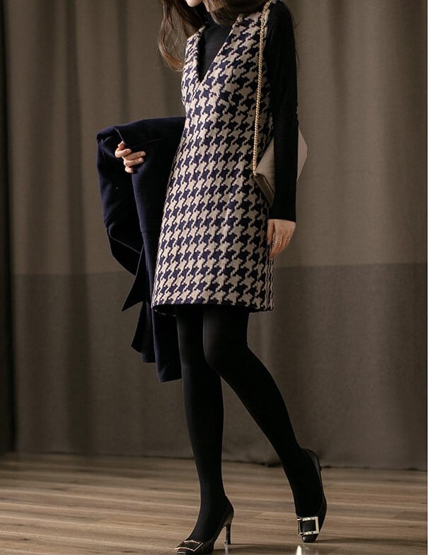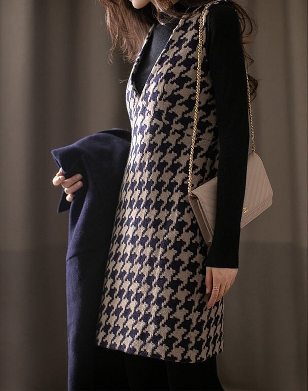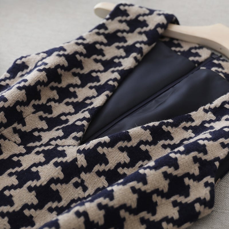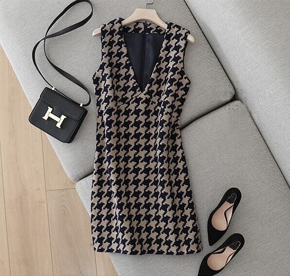 V neck elegant houndstooth middle wool dress