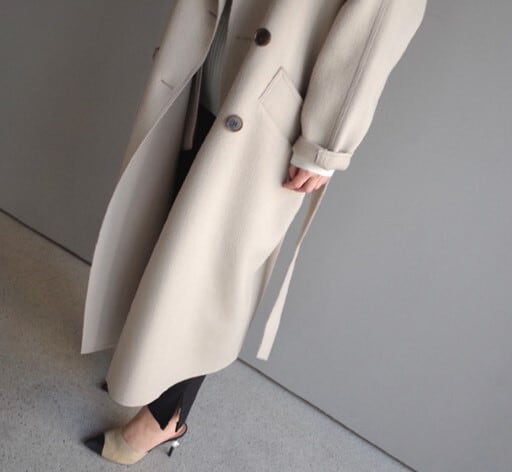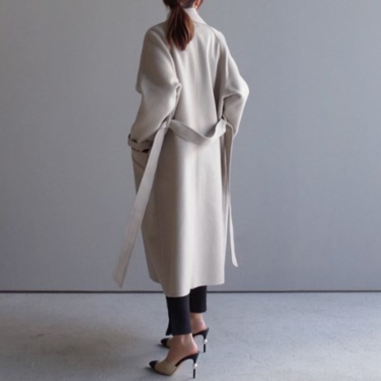 羽織るだけでフェミニンな雰囲気が漂うダブルブレストエレガントストラップウールコート。