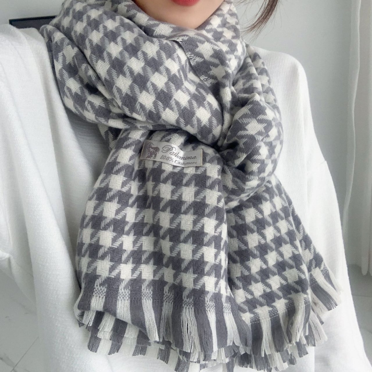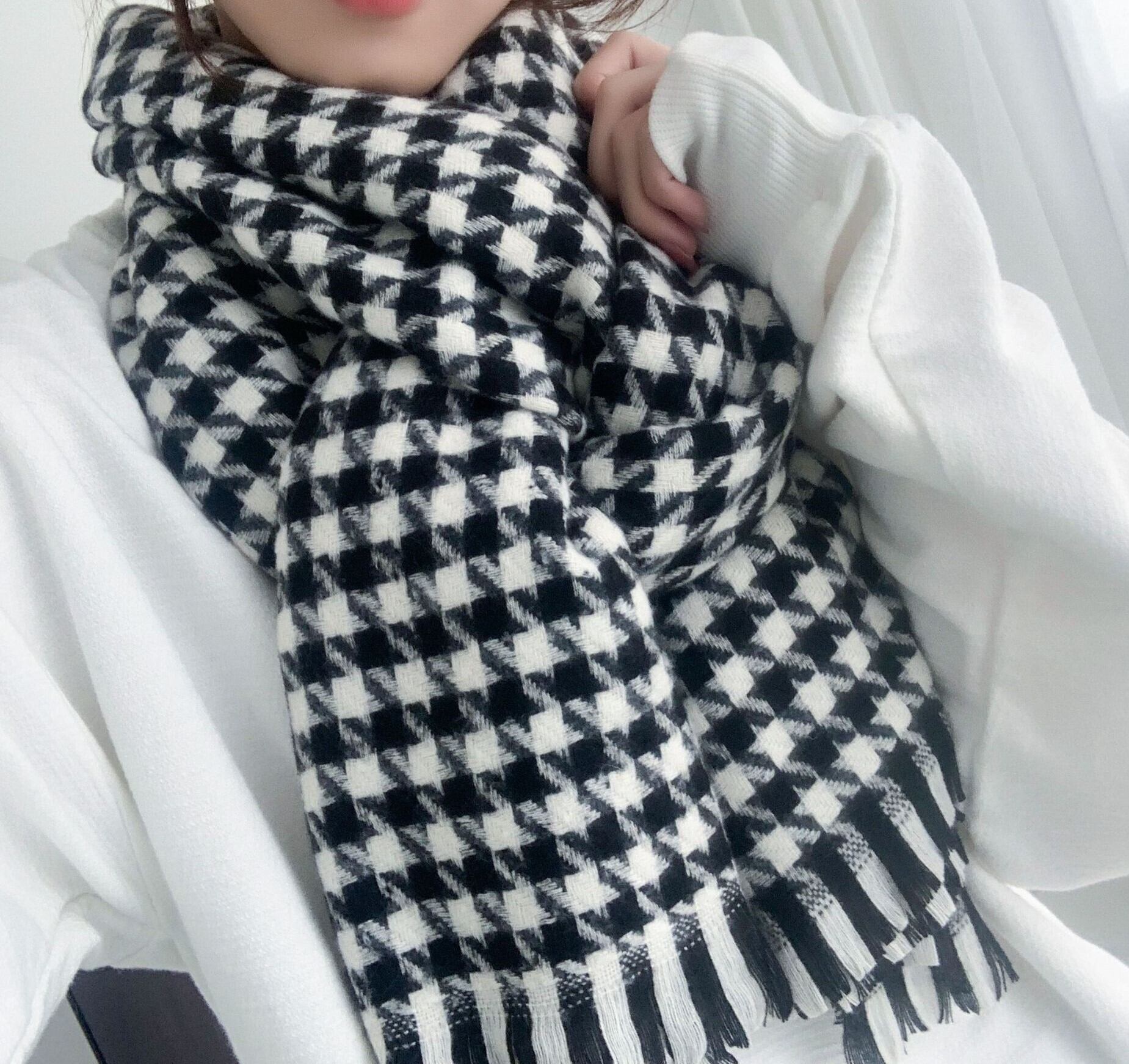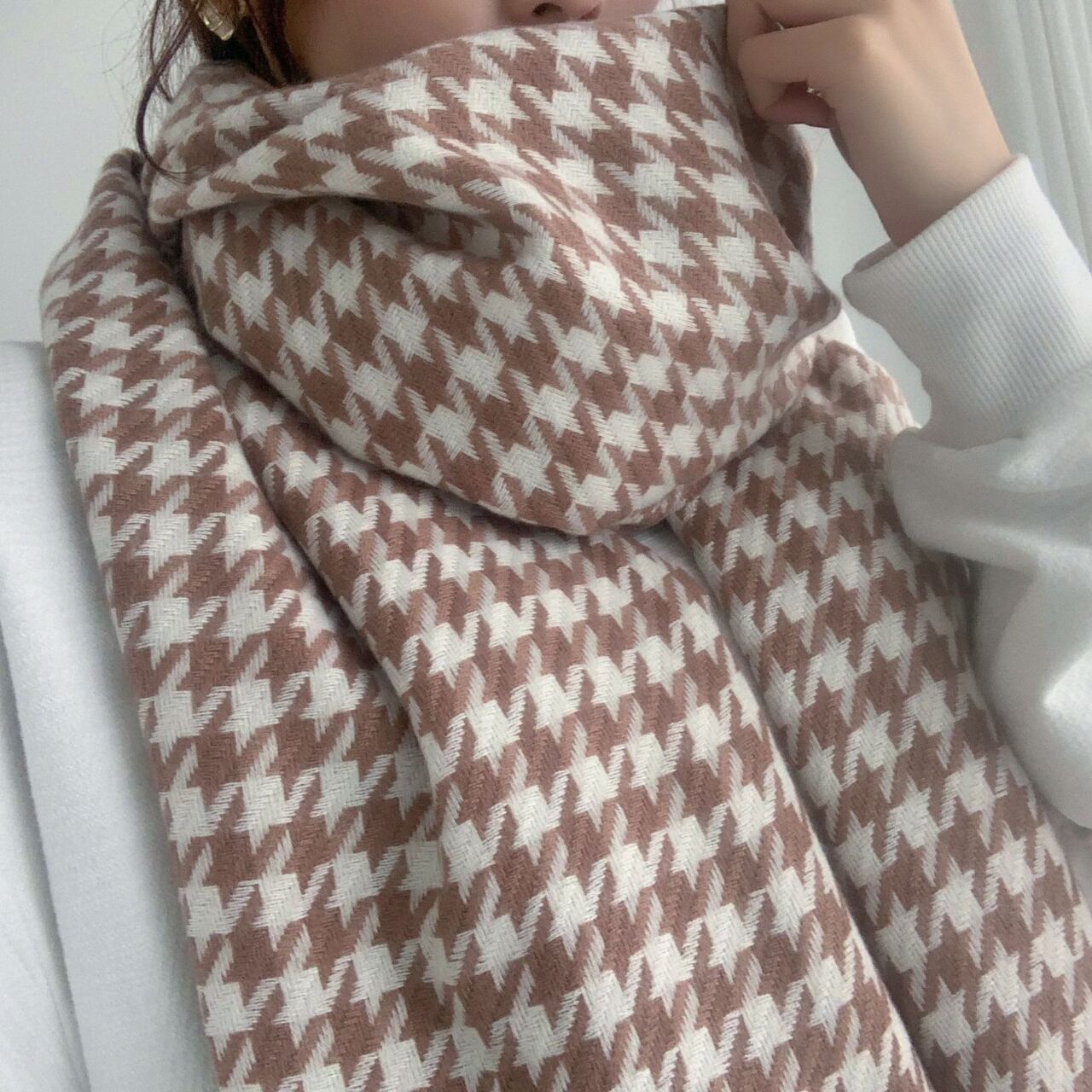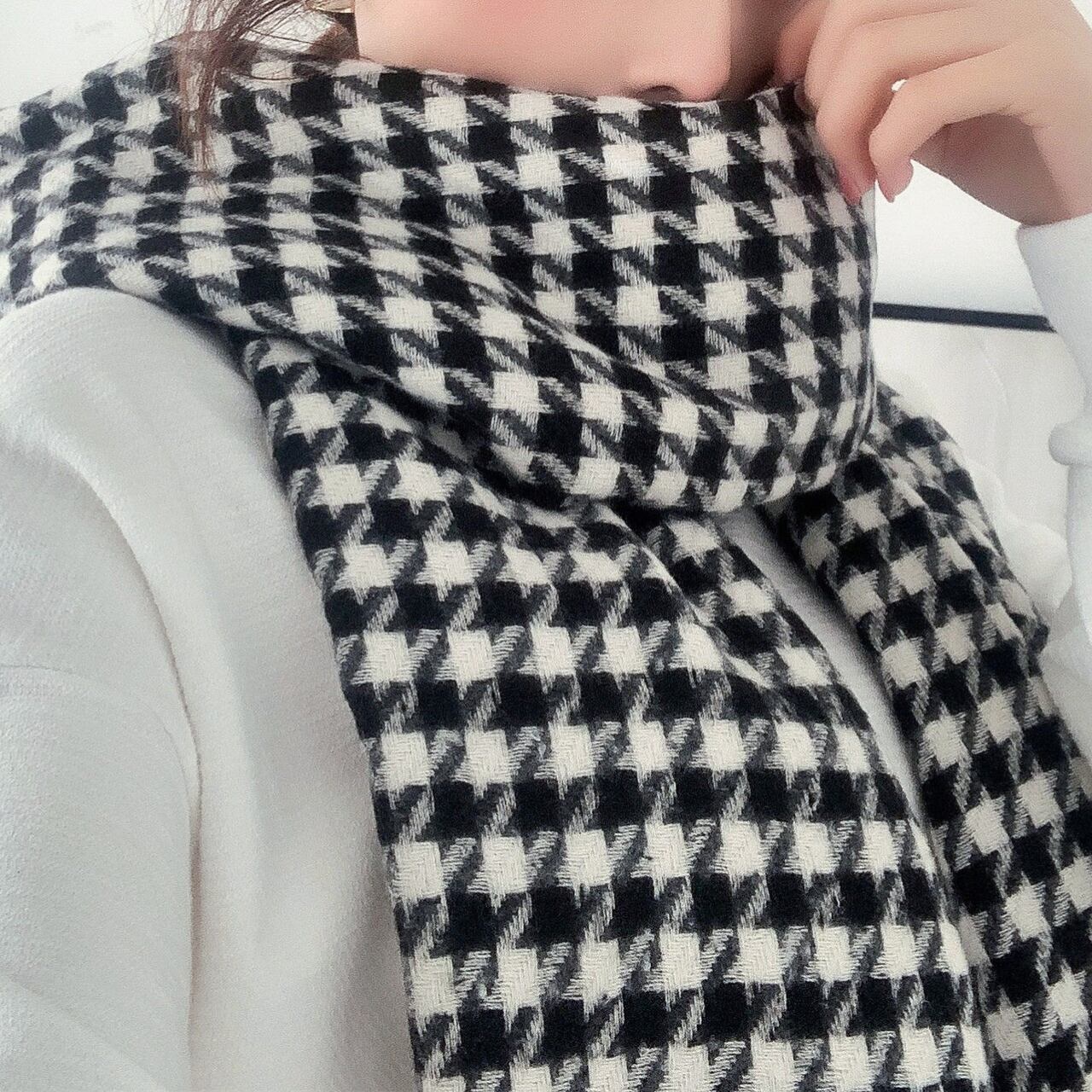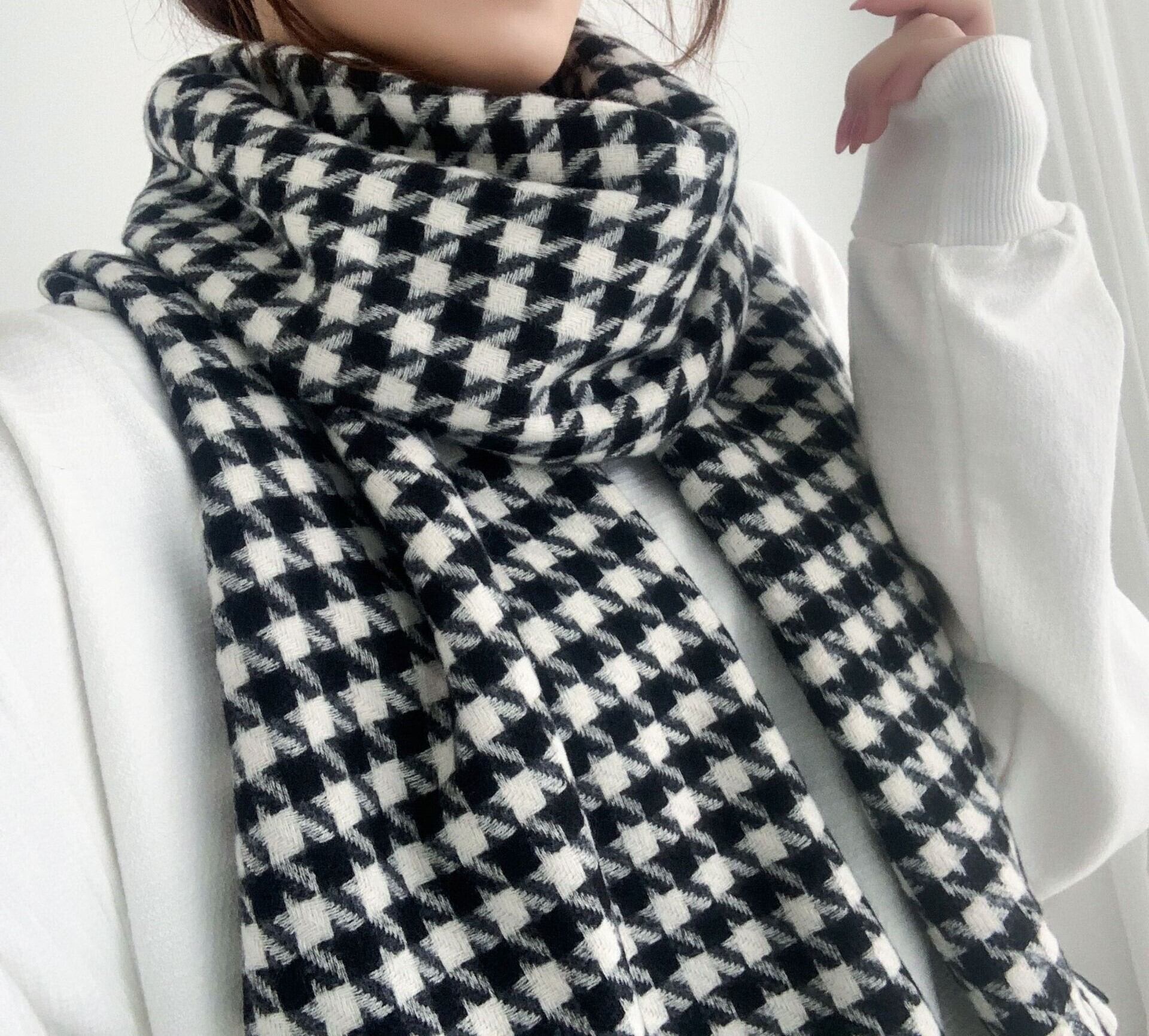 羽織るだけでフェミニンな雰囲気が漂うエレガント千鳥格子マフラー。