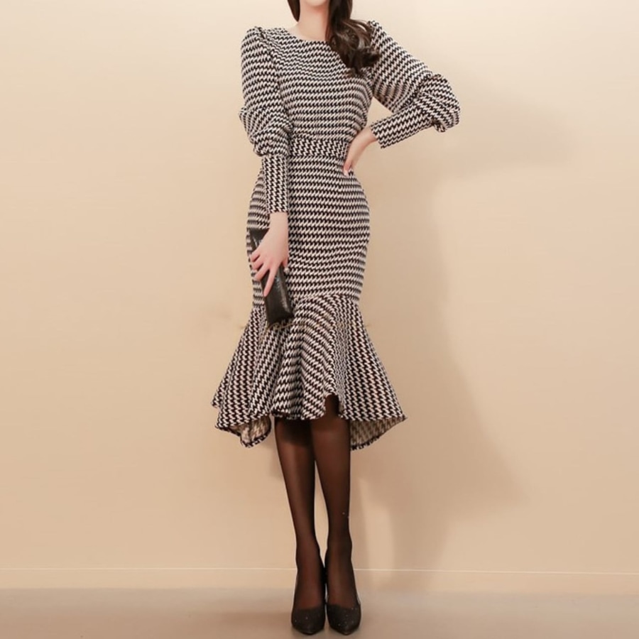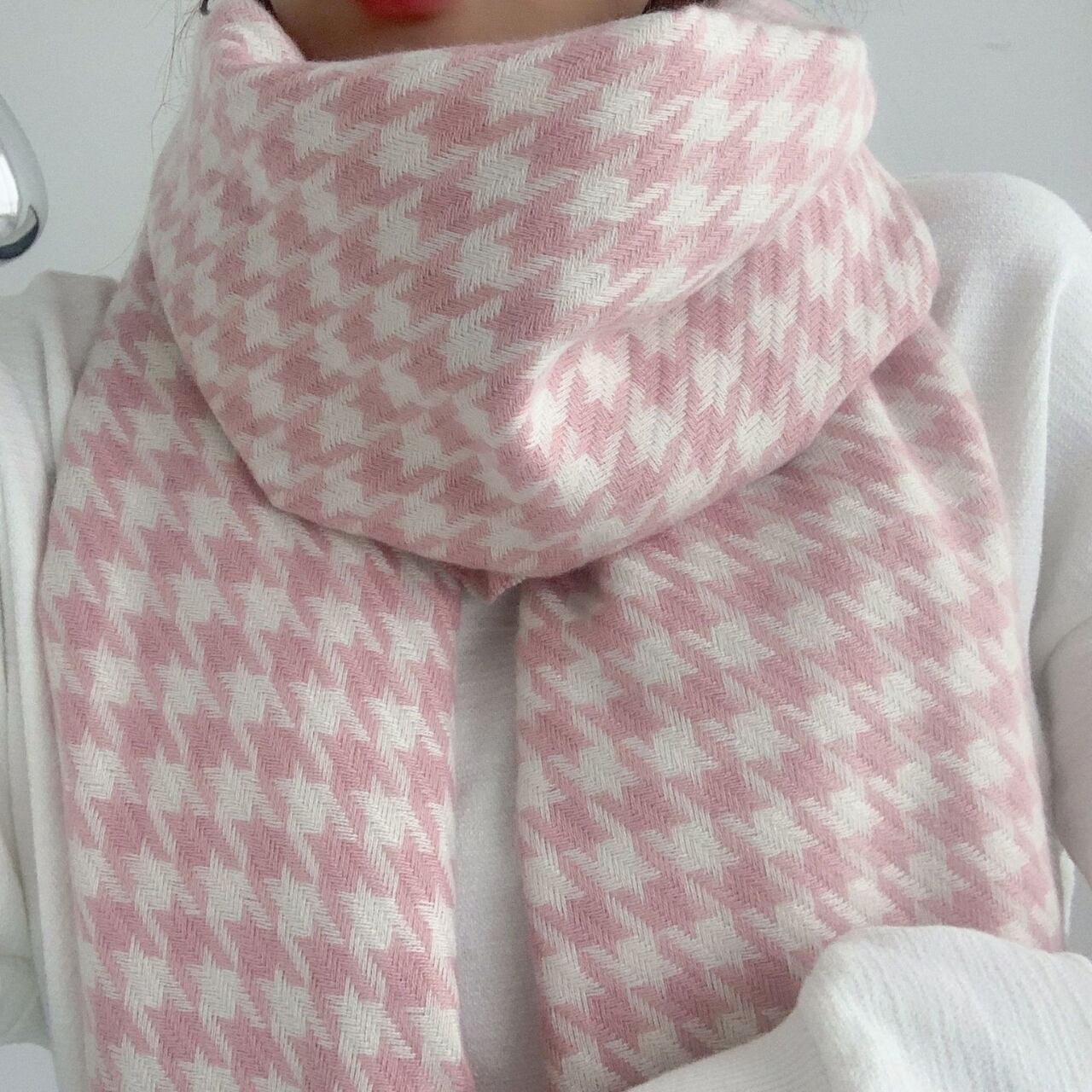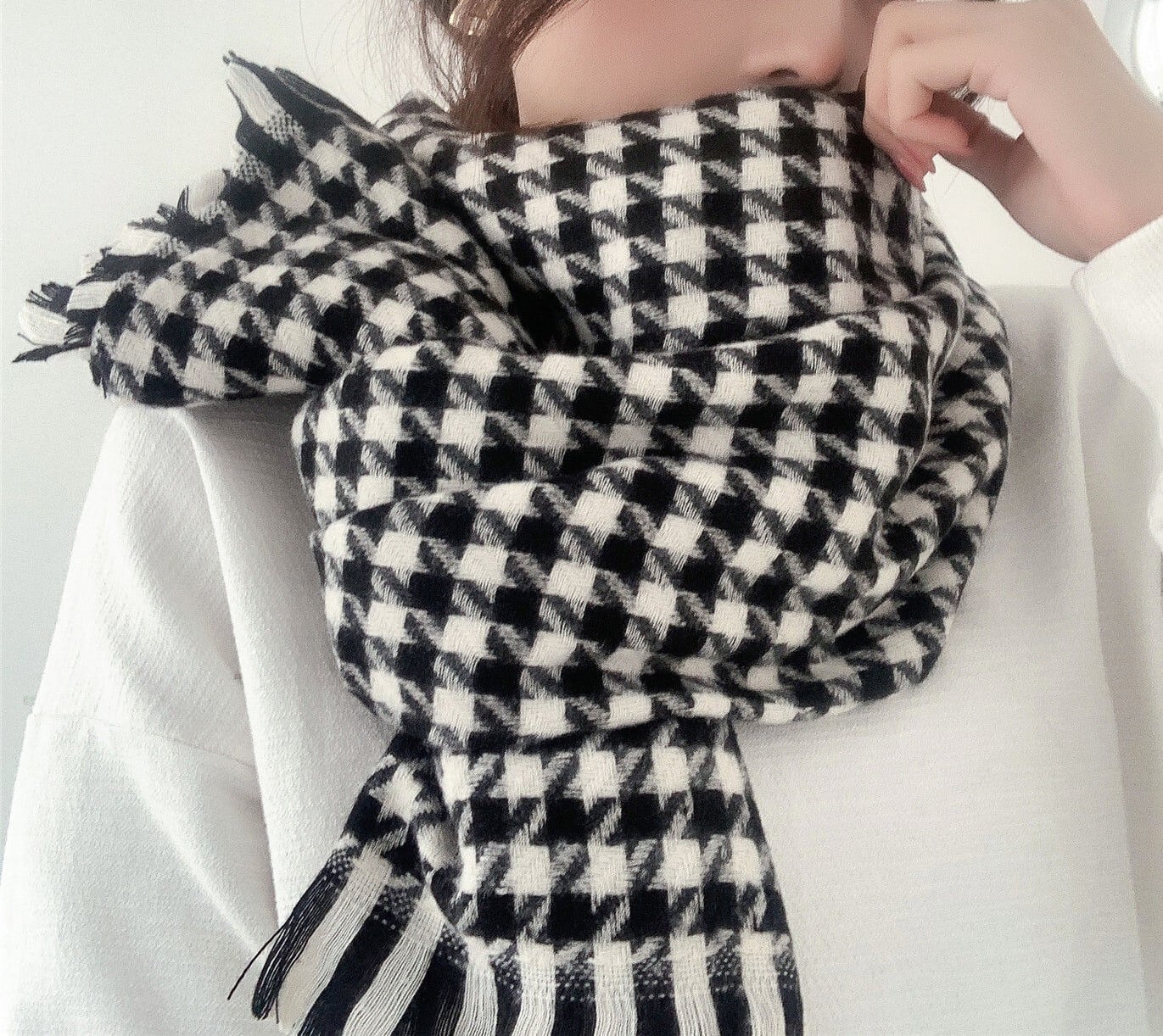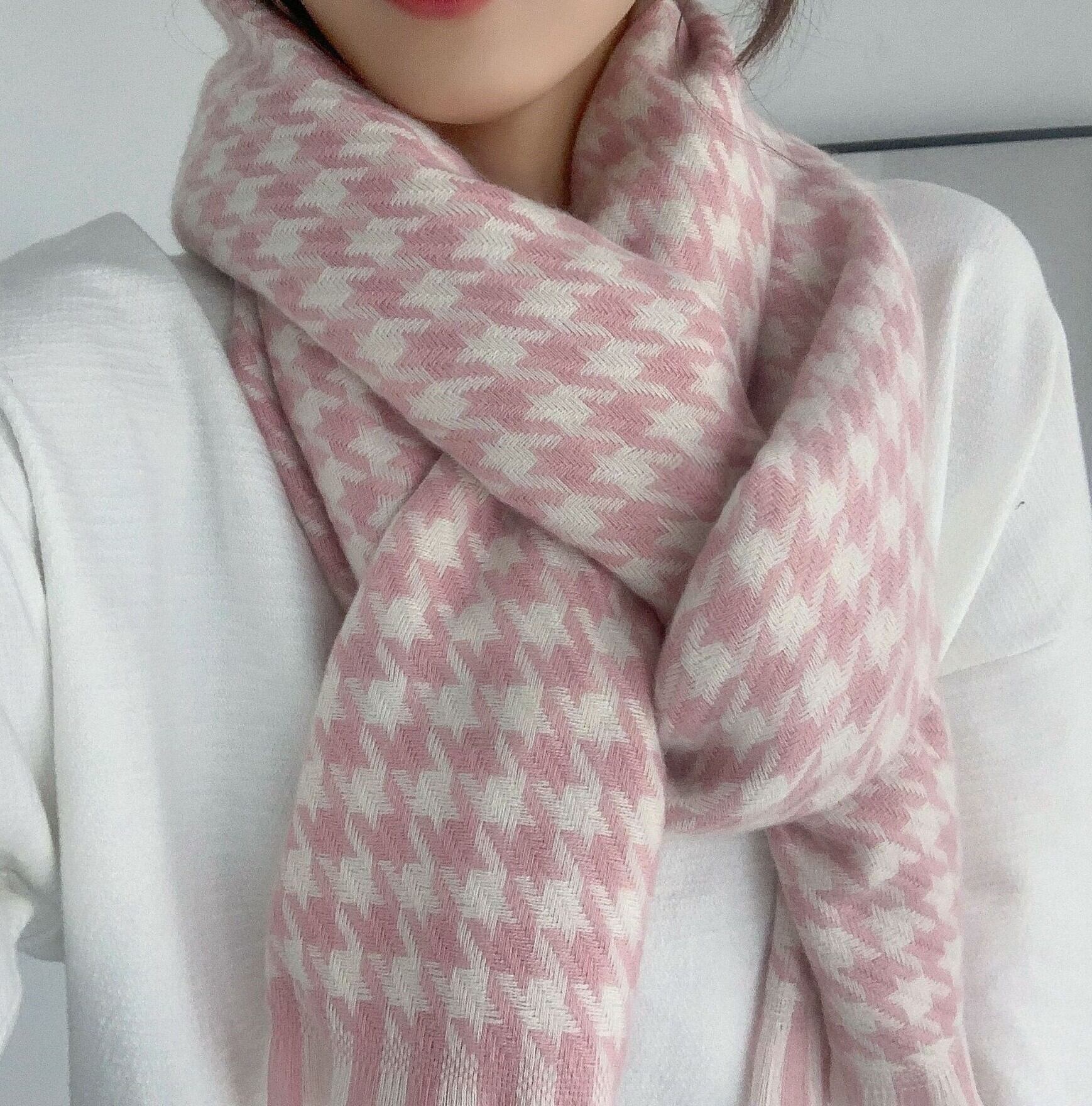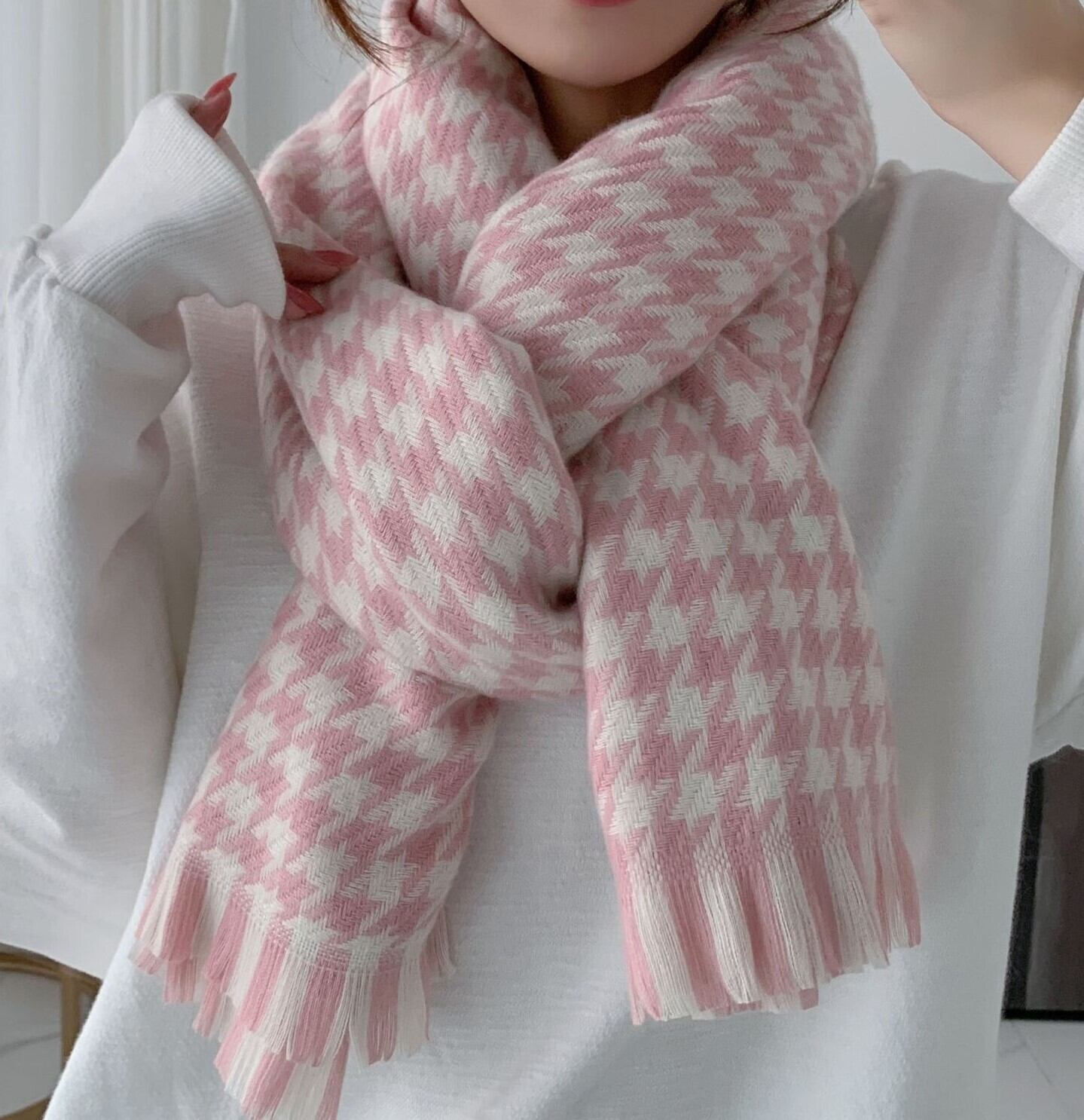 羽織るだけでフェミニンな雰囲気が漂うエレガント千鳥格子マフラー。