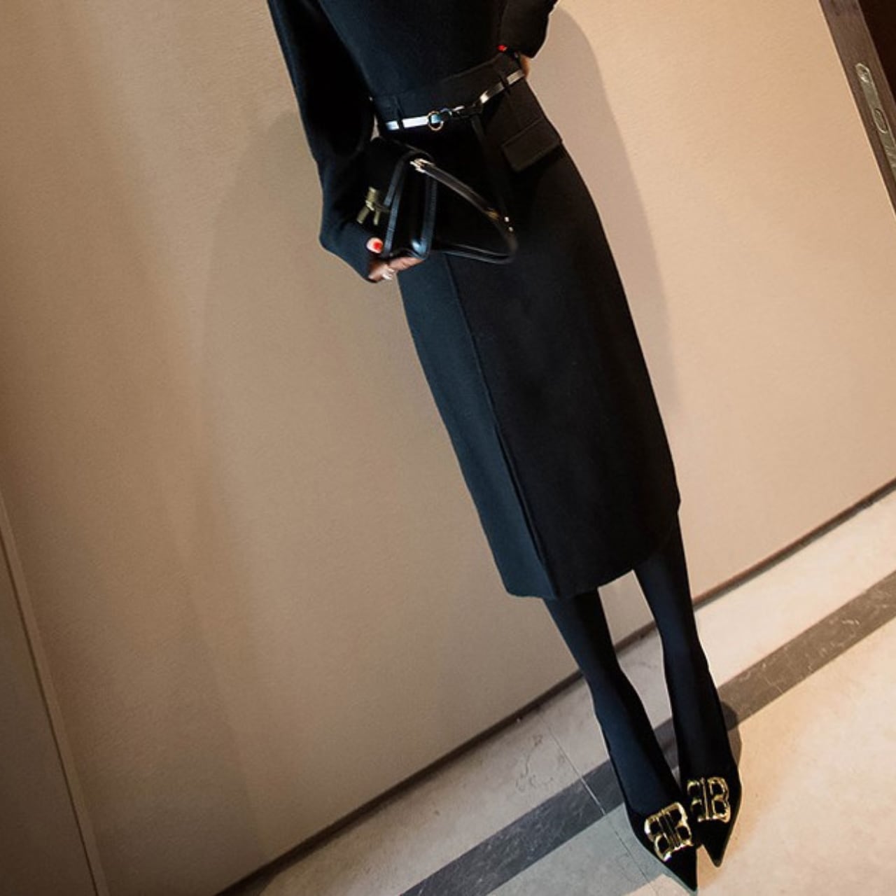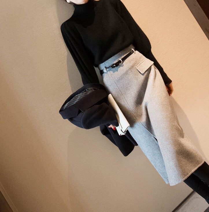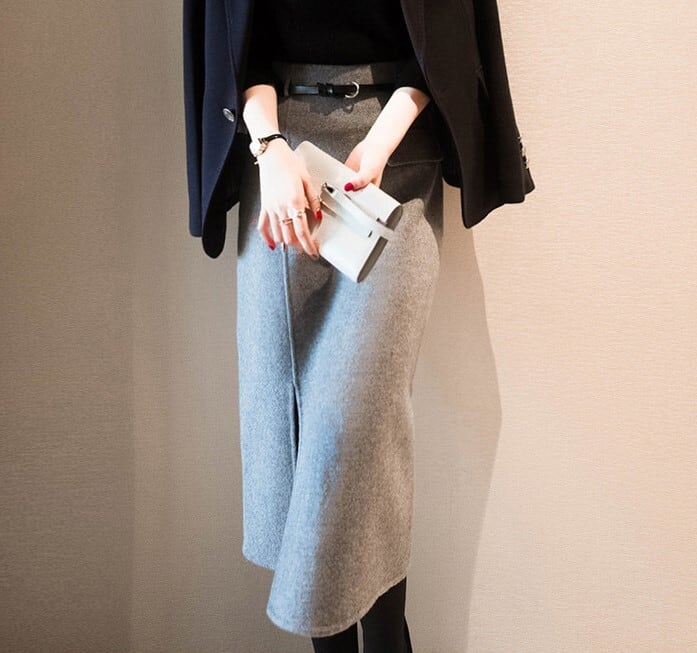 着用するだけでフェミニンな雰囲気が漂うハイウエストエレガントミドルウールスリムスカート。