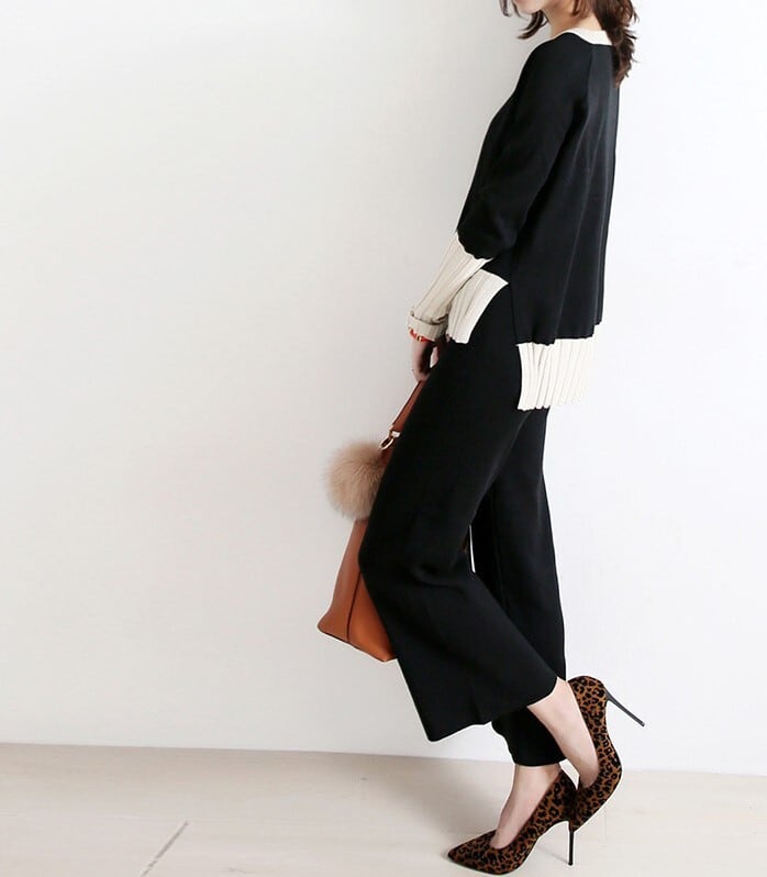Vネックのニットトップスとワイドレッグニットパンツのセット商品です。