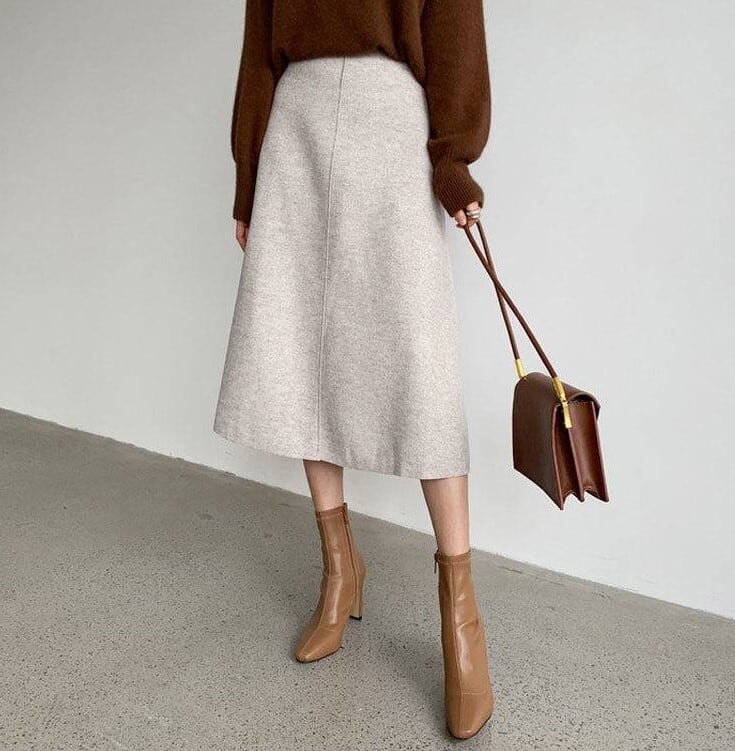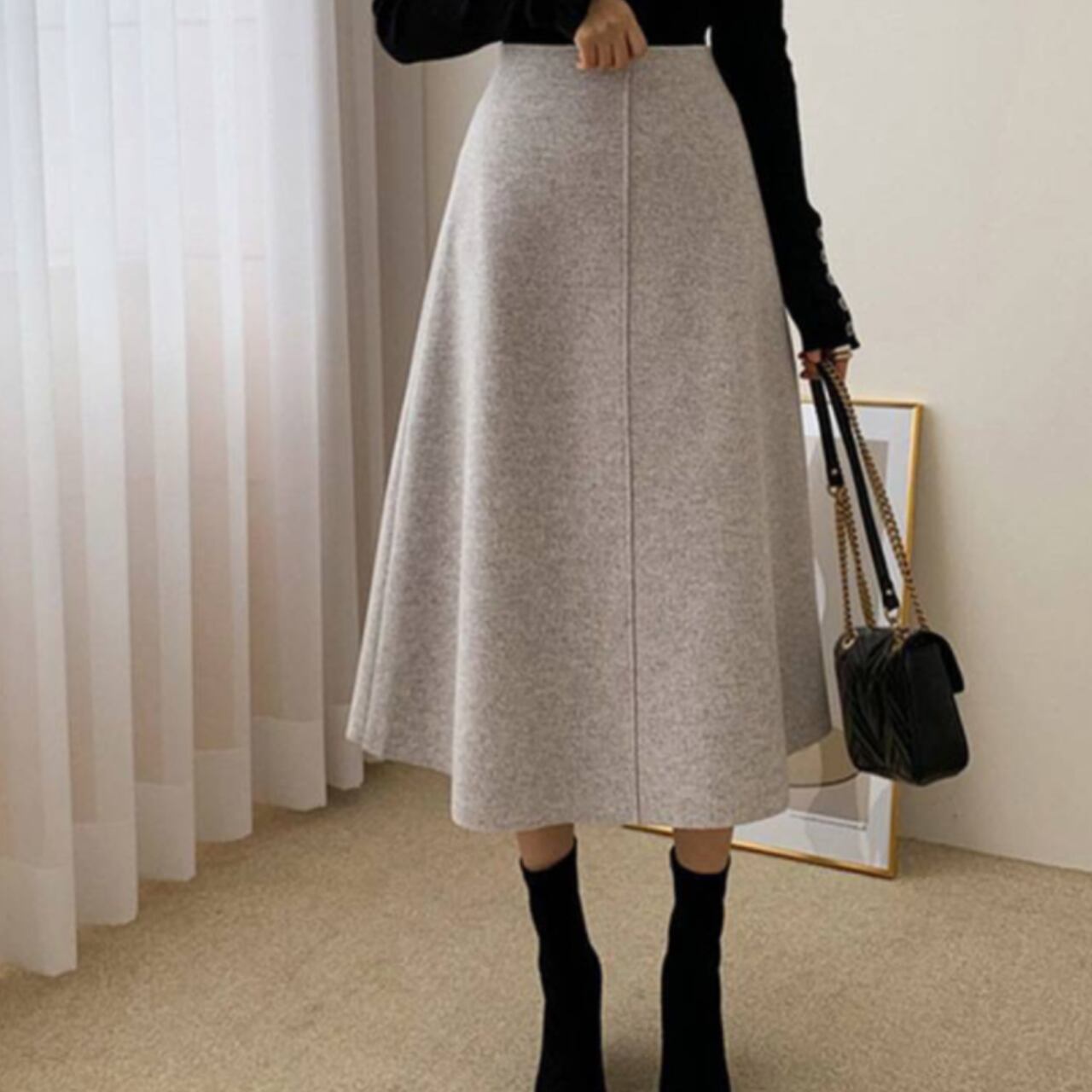 着用するだけでフェミニンな雰囲気が漂うハイウエストエレガントラージスイングウールスカート。