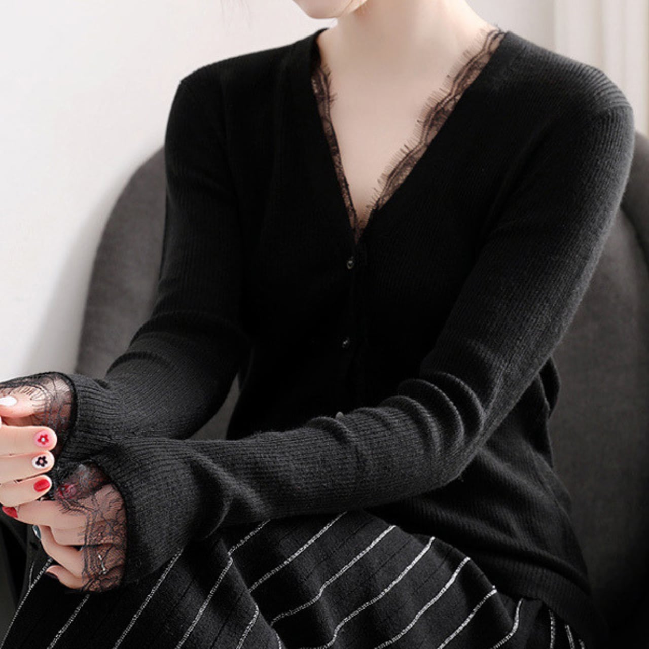 V neck elegant lace stitch cardigan