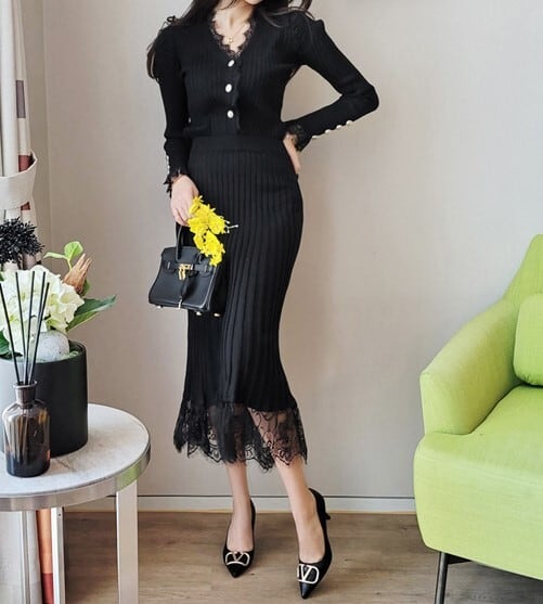 着用するだけでフェミニンな雰囲気が漂うVネックエレガントレースステッチニットドレスセットアップ。