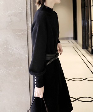 Half high neck elegant waist strap middle knit dress ( 2color )