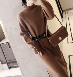 着用するだけで大人可愛い雰囲気が漂うハーフハイネックエレガントウエストストラップミドルニットドレス。