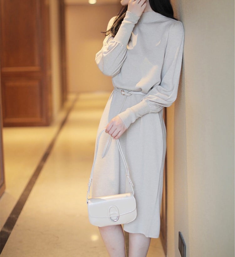着用するだけでフェミニンな雰囲気が漂うハーフハイネックエレガントランタンスリーブミドルニットドレス。