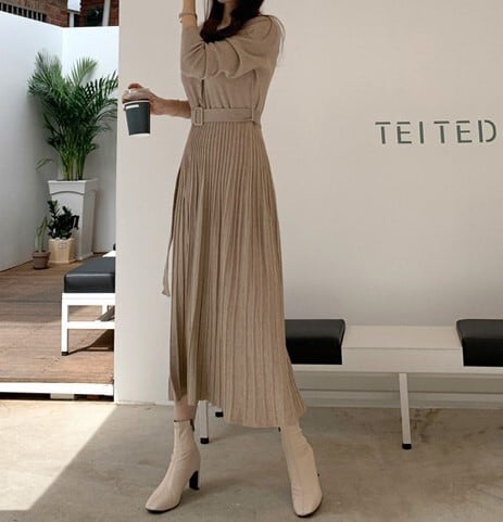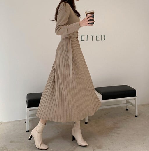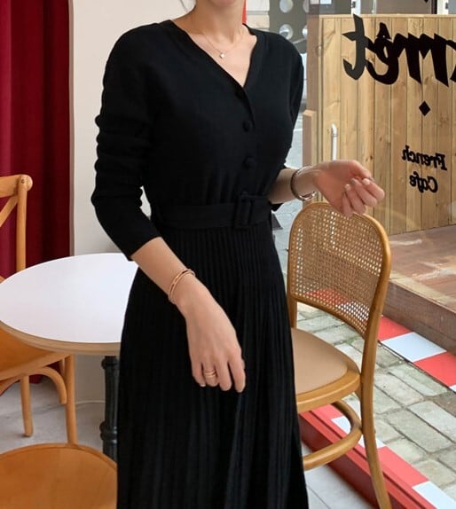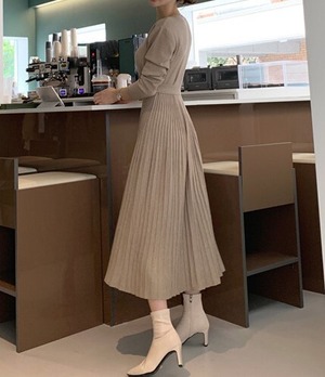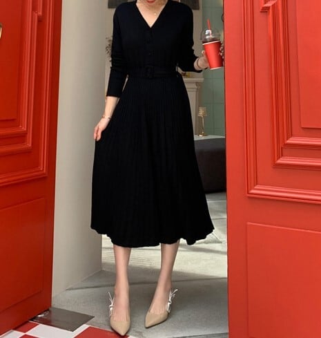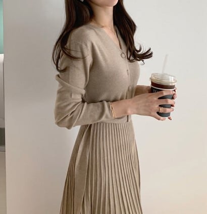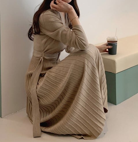 着用するだけで大人可愛い雰囲気が漂うVネックエレガントプリーツロングニットドレス。
