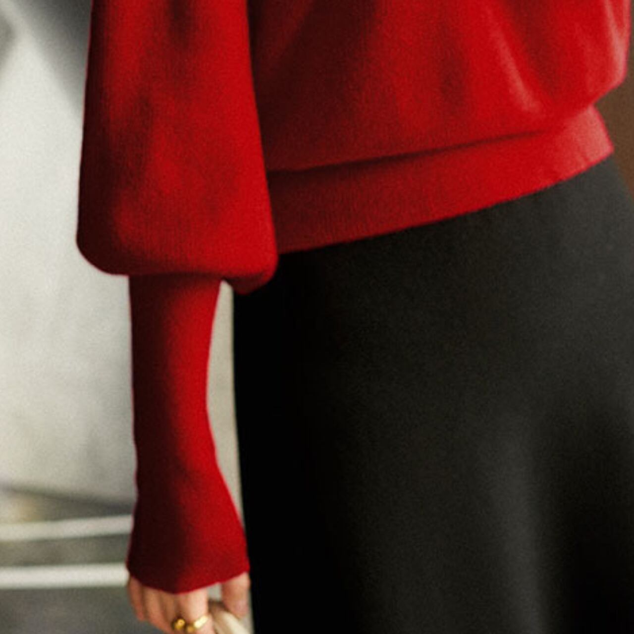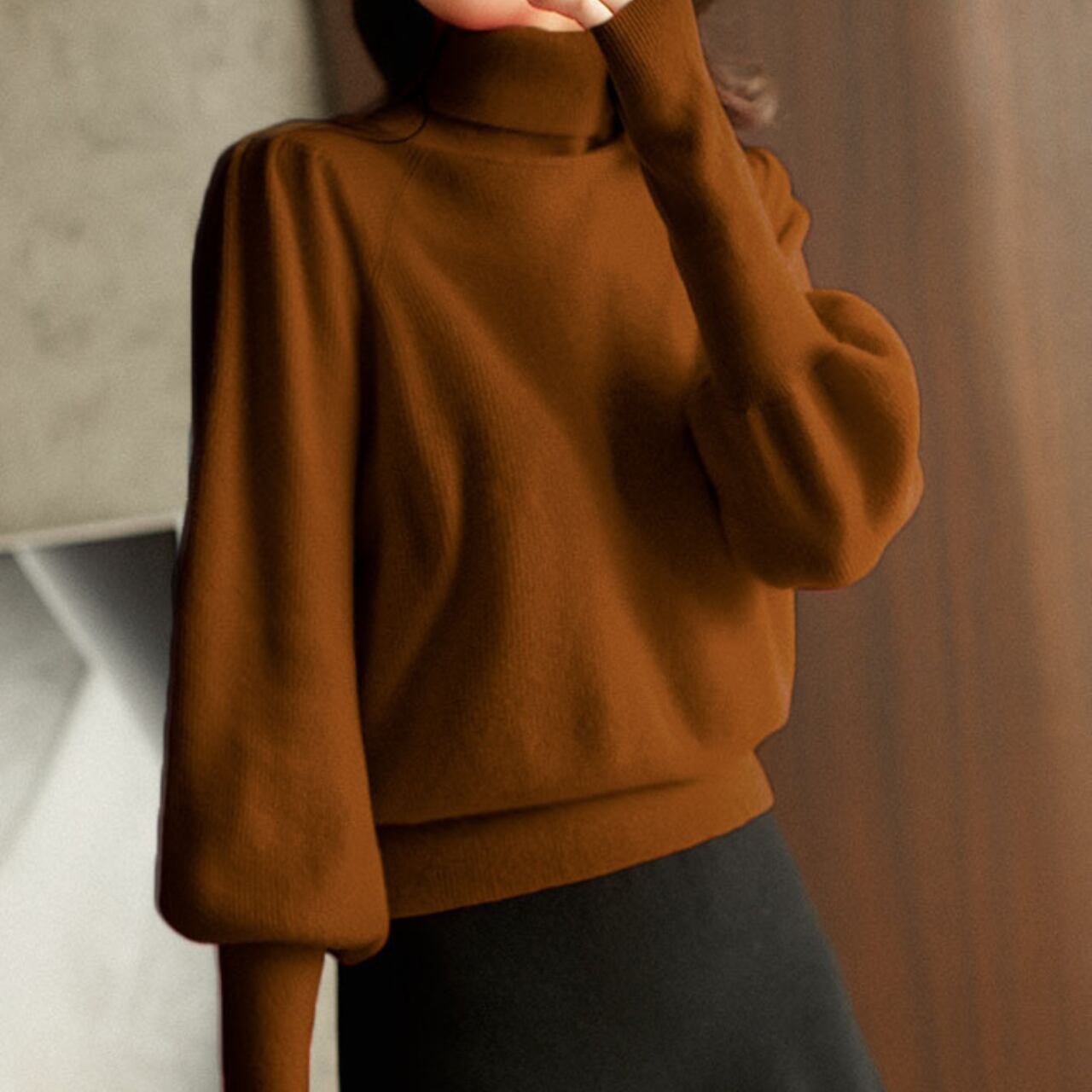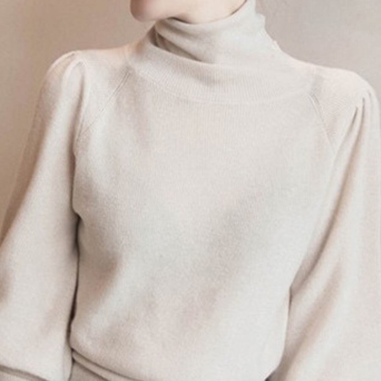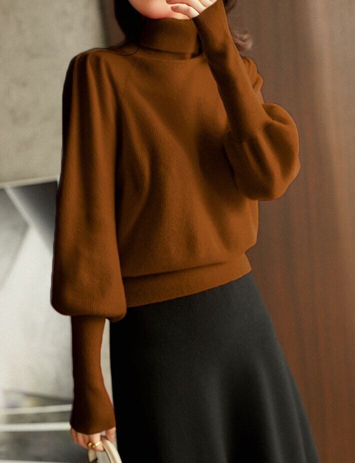 着用するだけで大人可愛い雰囲気が漂うハイネックエレガントパフスリーブニット 。