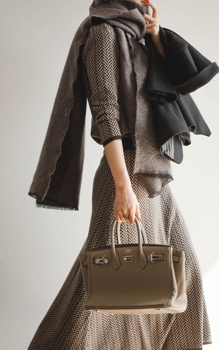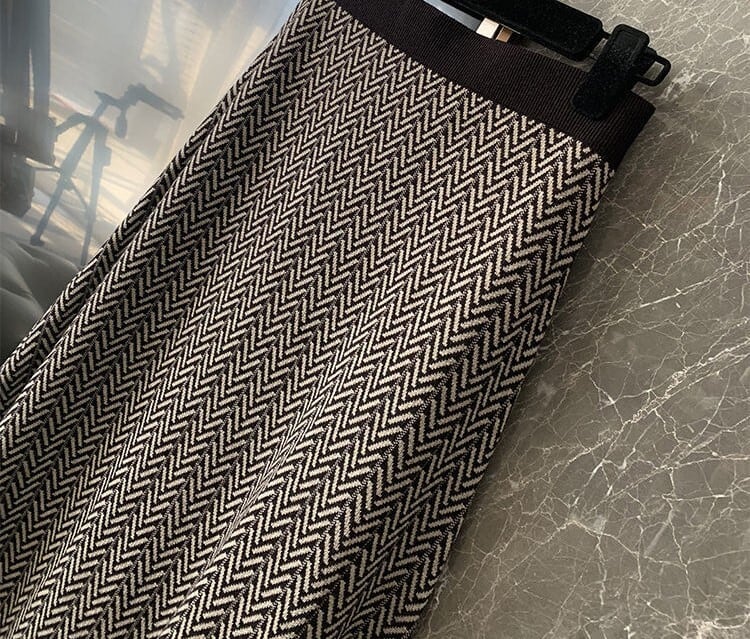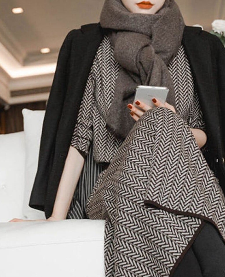 着用するだけで大人可愛い雰囲気が漂うラウンドネックエレガントヘリンボーンミドルニットドレスセットアップ。