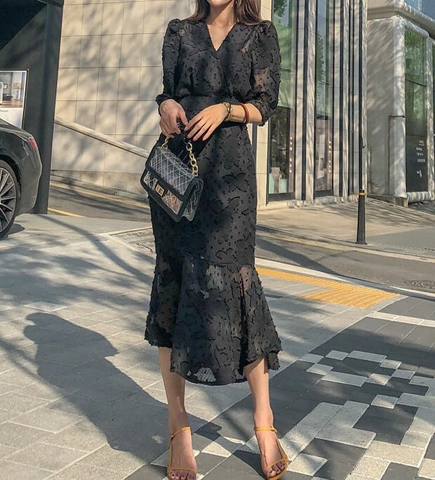 着用するだけでフェミニンな雰囲気が漂うVネックエレガントシフォンミドルマーメイドドレス。