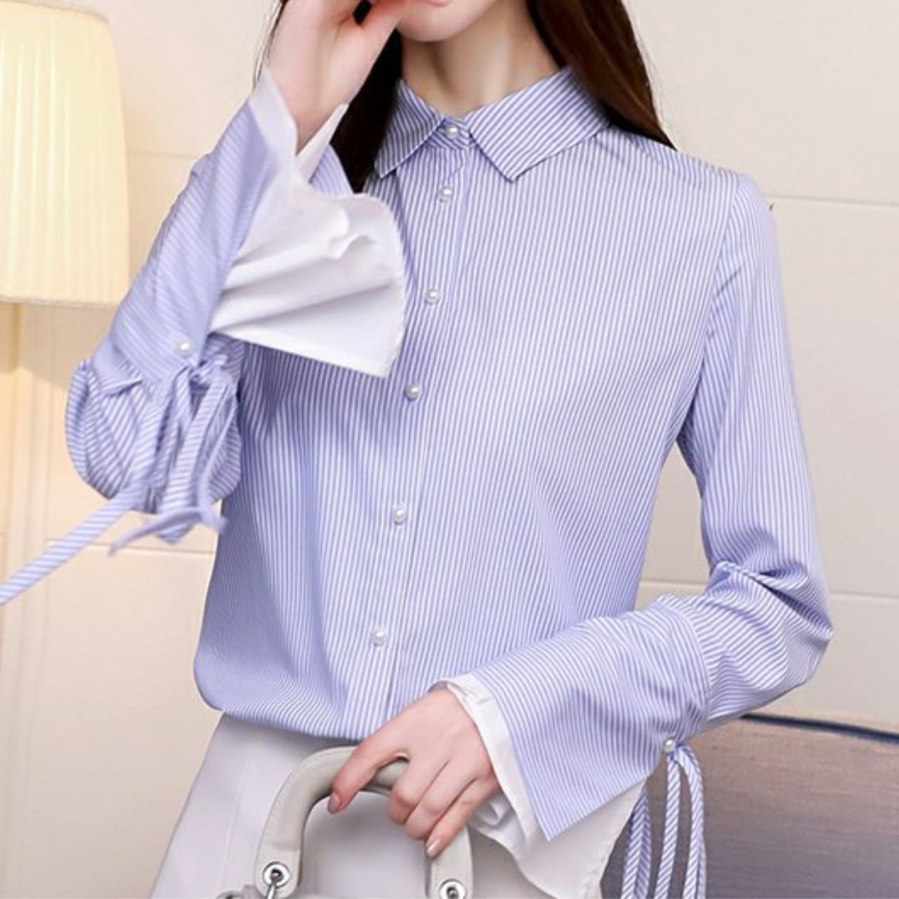 着用するだけでエレガントで大人可愛いムードが漂うフレアスリーブエレガントストライプブラウス。