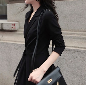 着用するだけでフェミニンな雰囲気が漂うスーツカラーエレガントレトロストラップミドルドレス 。