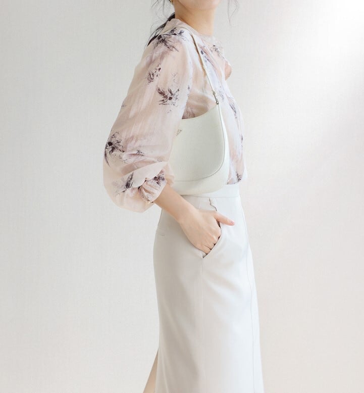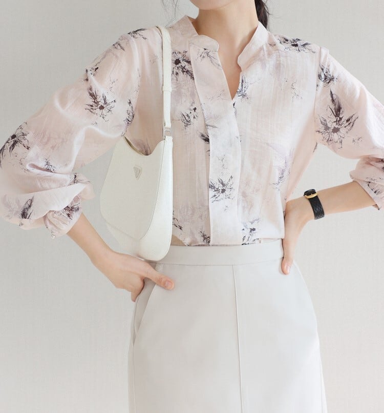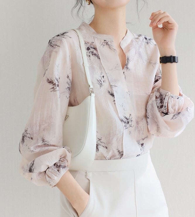 着用するだけで大人可愛さが漂うカラーレスエレガントレトロフローラルシフォンシャツ。
