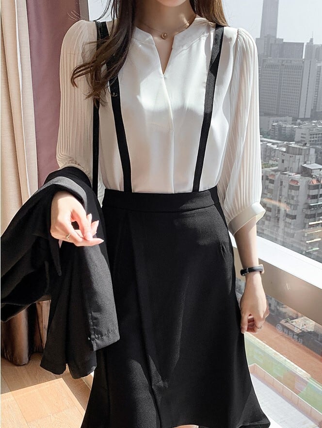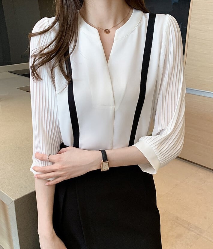 着用するだけで上品で大人可愛い雰囲気が漂うスモールVネックエレガントメッシュスリーブシフォンブラウス。