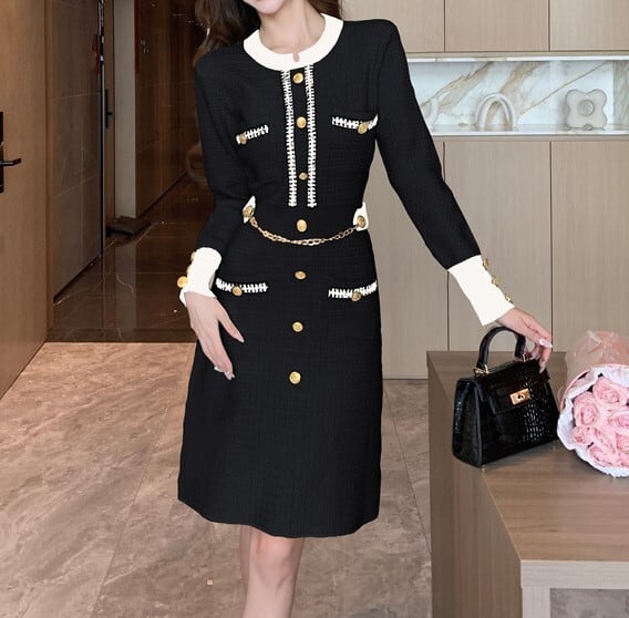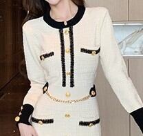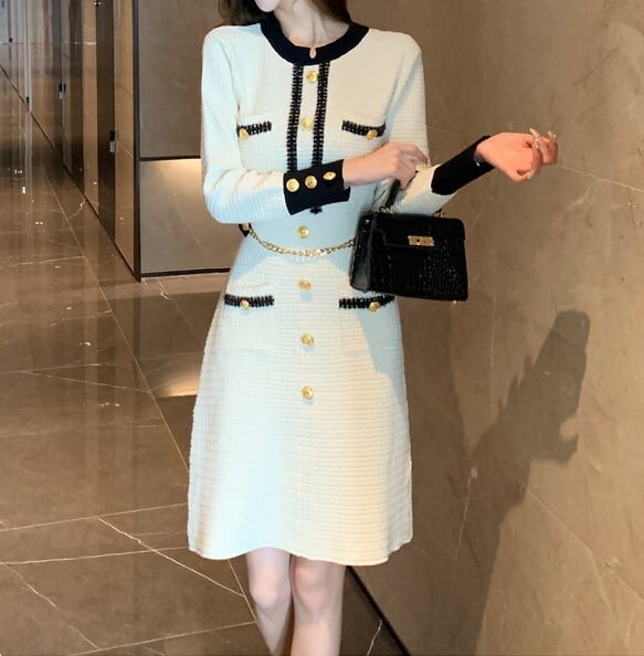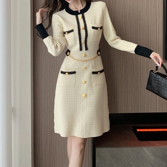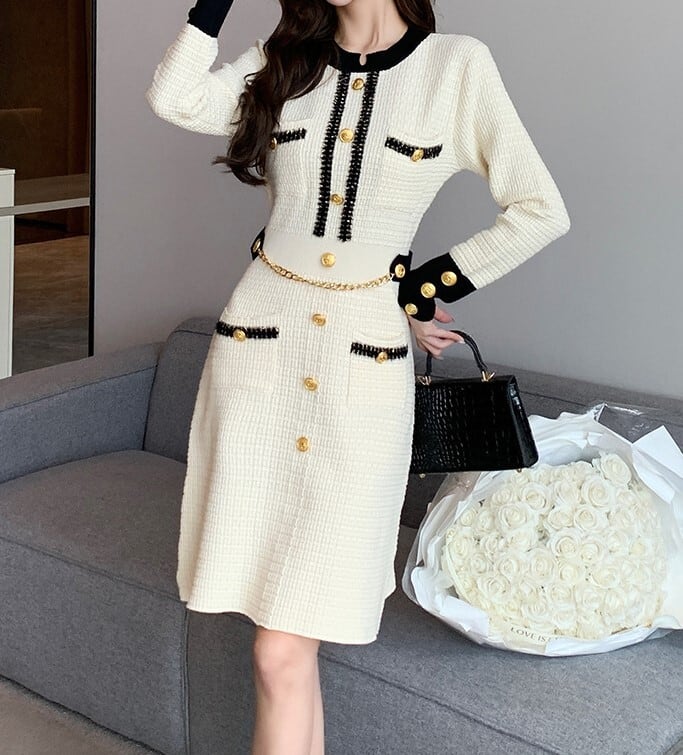 着用するだけでフェミニンな雰囲気が漂うシングルブレストエレガントツイードスタイルミドルニットドレス。