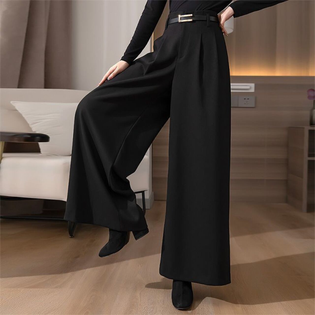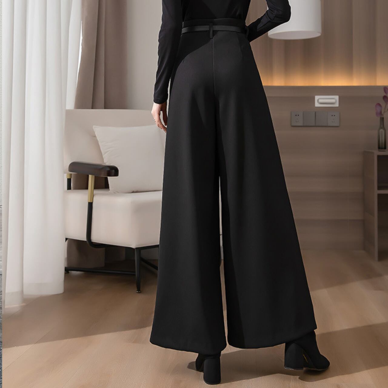 ハイウエストとワイドレッグデザインがスタイルを引き締めます。