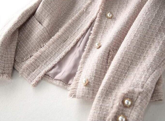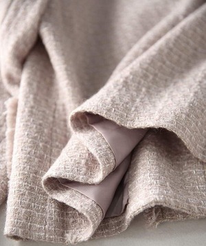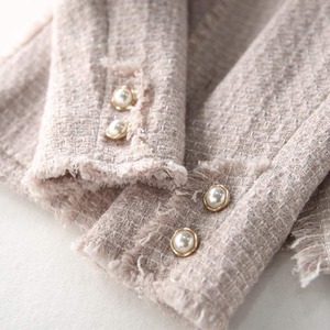 羽織るだけでフェミニンな雰囲気が漂うカラーレスエレガントフリンジツイードショートジャケット。