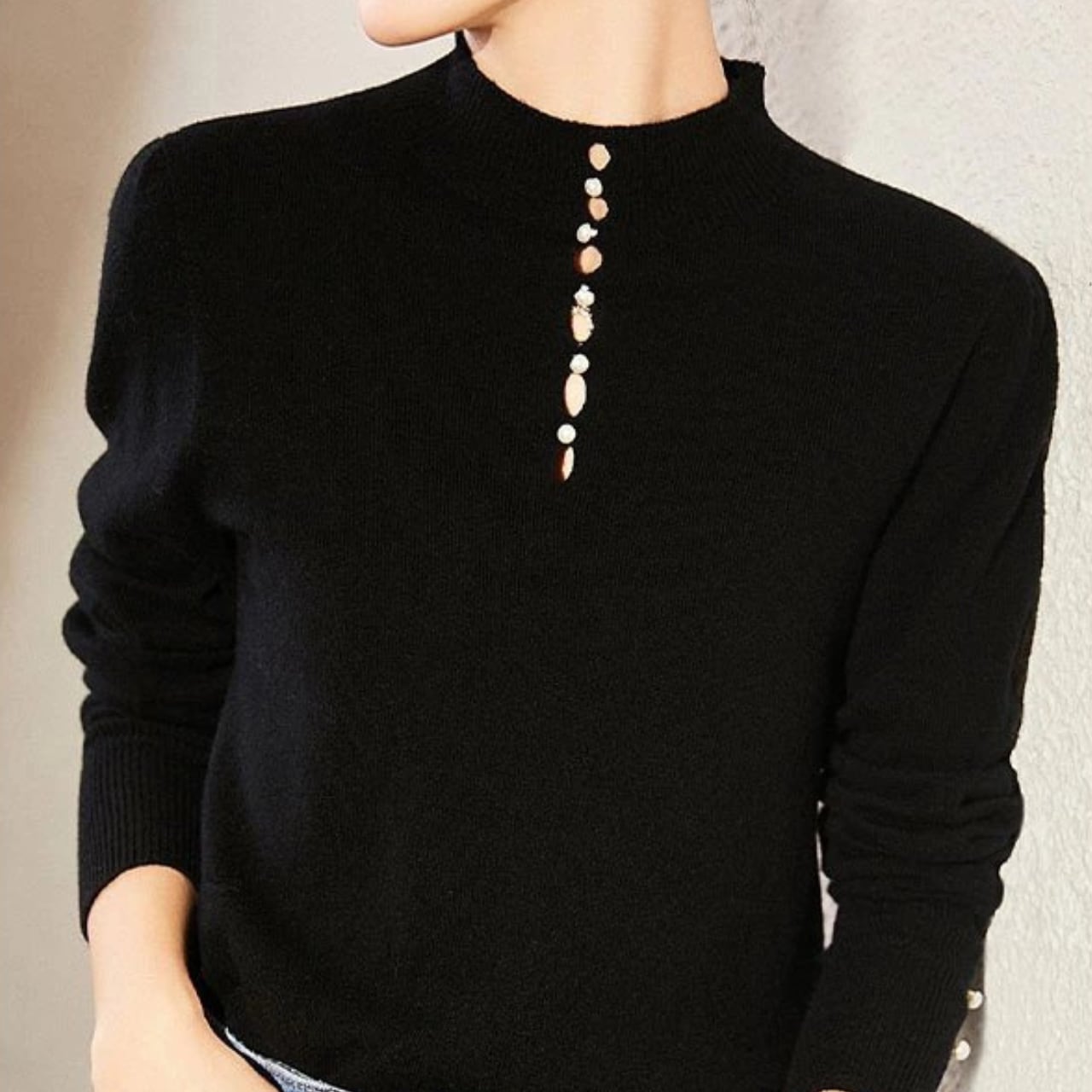 首元と袖のパールデザインがアクセント。