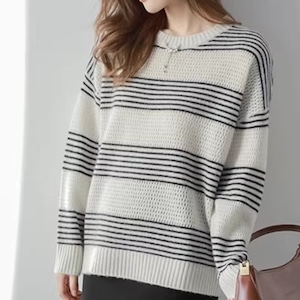 着用するだけでフェミニンな雰囲気が漂うエレガントレトロストライプルーズニット。