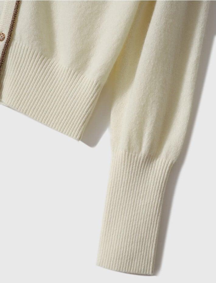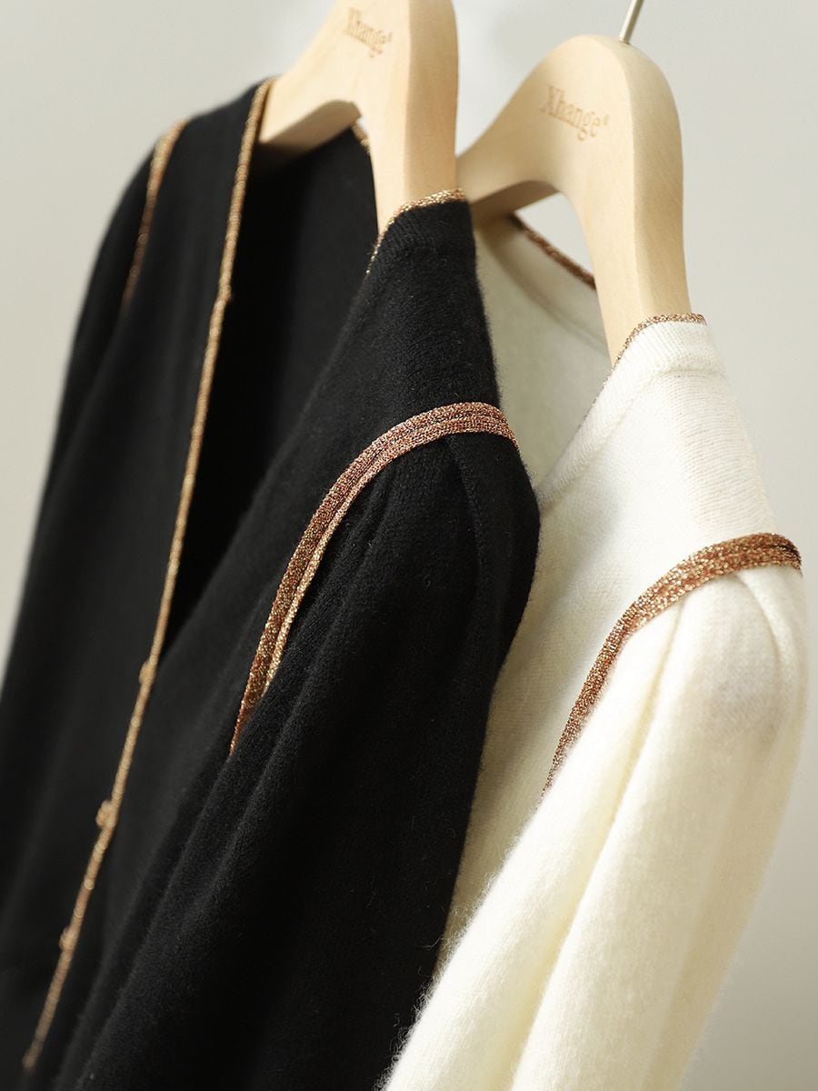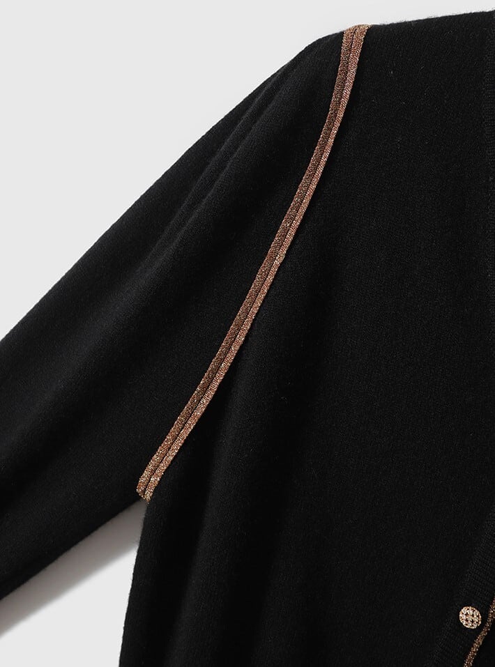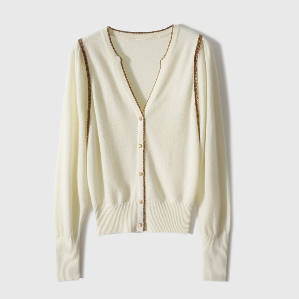 着用するだけで大人可愛い雰囲気が漂うVネックエレガントゴールドステッチニットカーディガン。