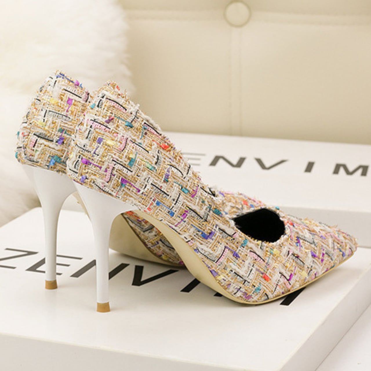 足元をフェミニンに演出するエレガントツイードパンプス。
