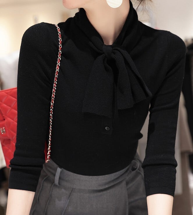 着用するだけで大人可愛い雰囲気が漂うチェストリボンエレガントニット。