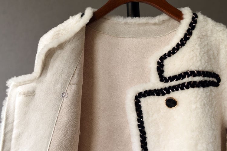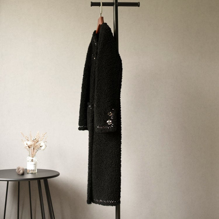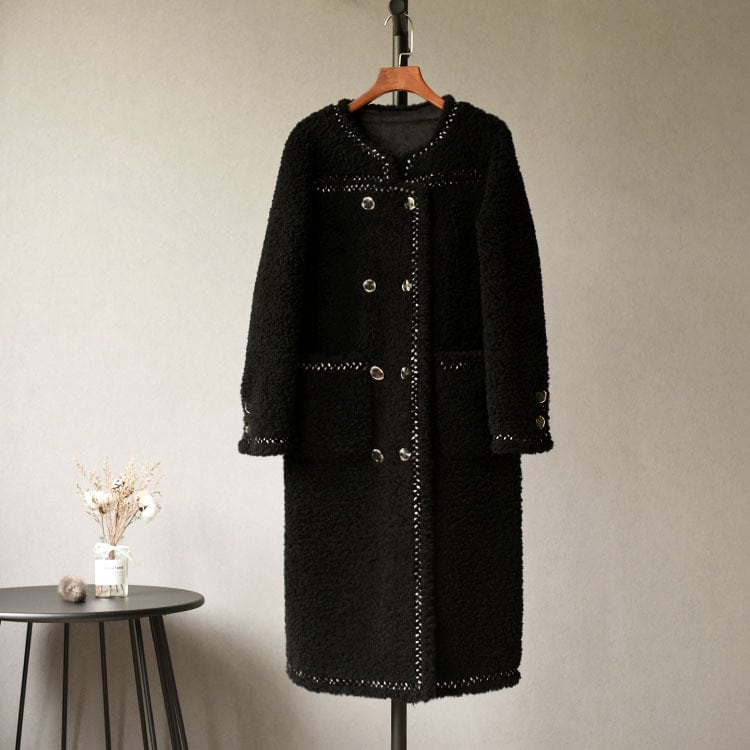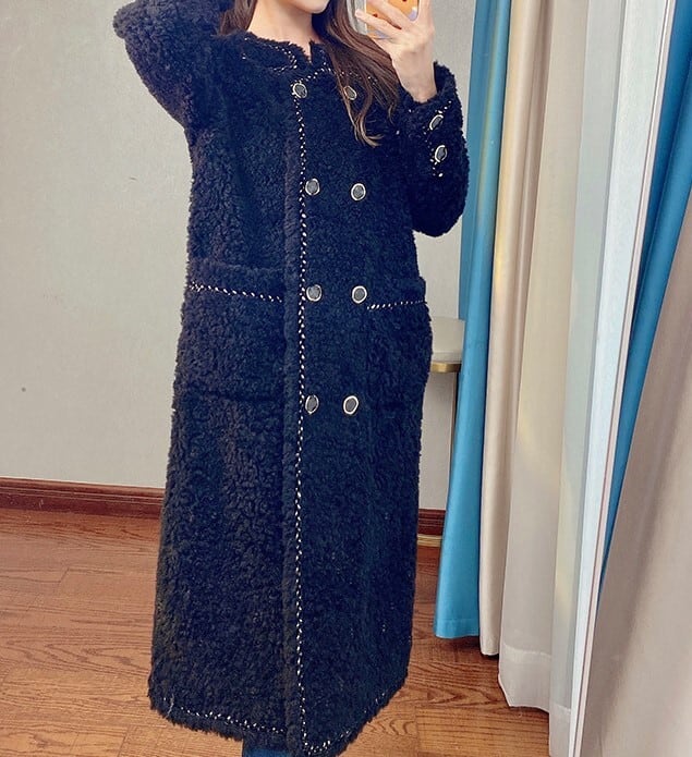 羽織るだけでフェミニンな雰囲気が漂うカラーレスエレガントダブルブレストロングボアコート。